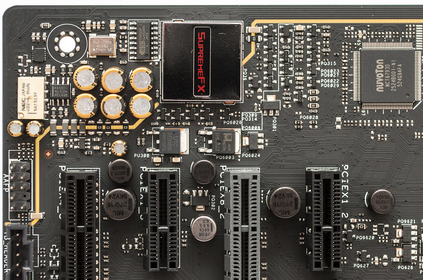 В основе аудиоподсистемы SupremeFX 2015 лежит современный 7.1-канальный HDA-кодек Realtek ALC1150. Для защиты от электромагнитных помех звуковой чип накрыт металлическим экраном, в металлических проводниках печатной платы сделан изолирующий зазор, отделяющий аудиоподсистему от остальной части материнской платы. На выходе на наушники используется цифро-аналоговый преобразователь ESS ES9023P. В выходных каскадах установлены японские электролитические конденсаторы NICHICON, для работы со стереогарнитурами с высоким внутренним сопротивлением применён операционный усилитель RC4580. Кроме того, для предотвращения щелчка во время подачи питания на материнскую плату служит миниатюрное электромагнитное реле.