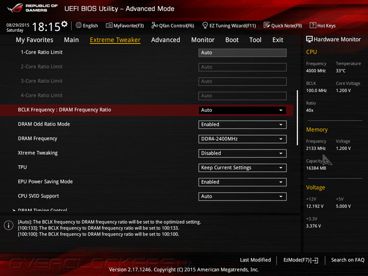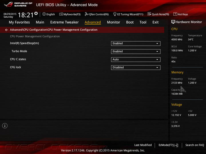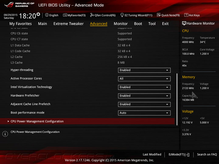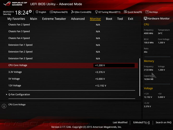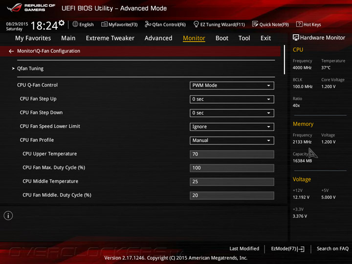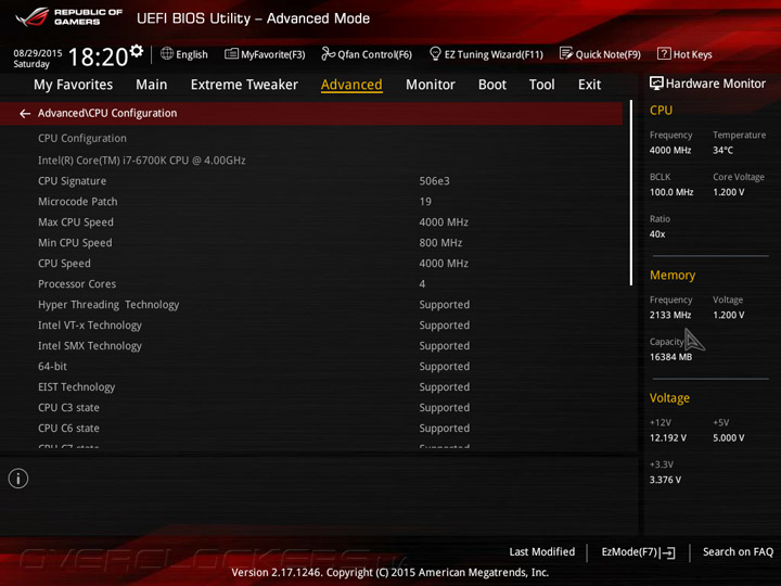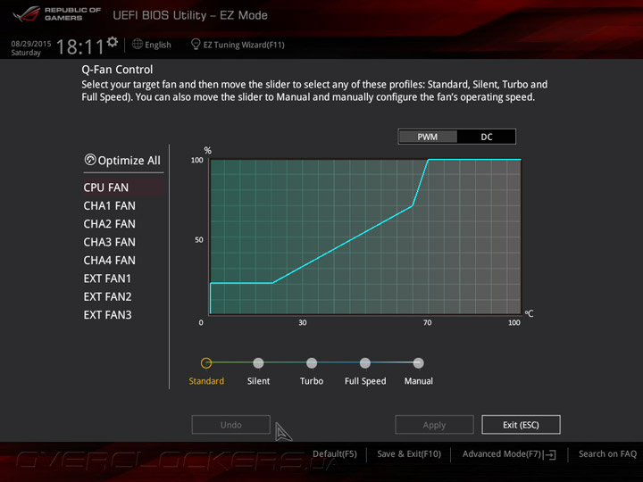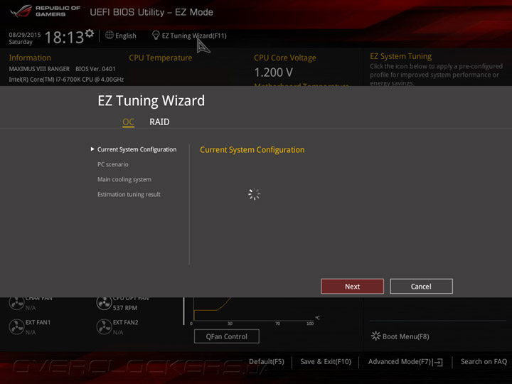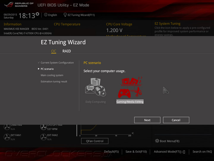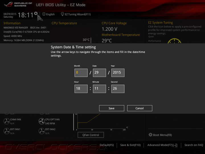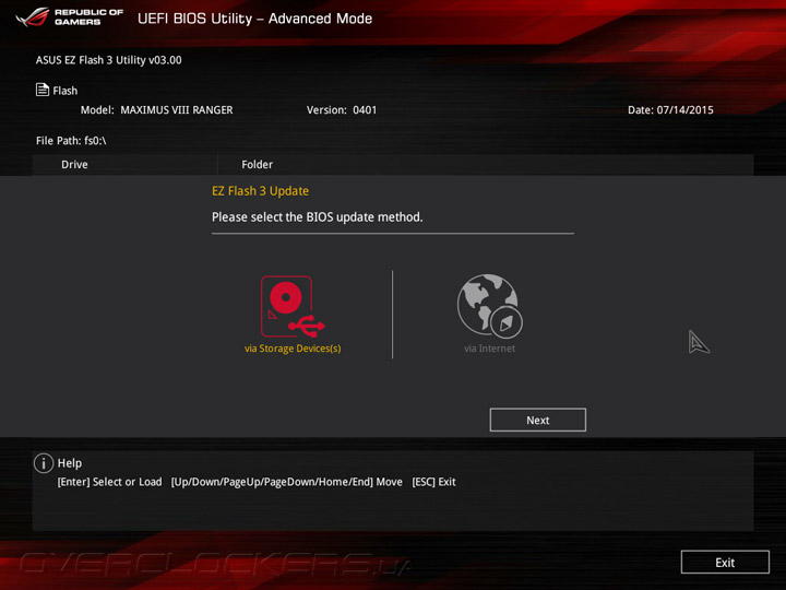Системная плата Maximus VIII Ranger оснащена прошивкой на базе управляющего микрокода UEFI, интерфейс меню настройки напоминает о «материнках» ASUS семейства Republic of Gamers на базе чипсетов Intel 9-й серии. UEFI Setup предлагает два режима: упрощенный EZ Mode, который служит для базовой конфигурации системной платы, и расширенный Advanced Mode, предназначенный для тонкой настройки всех возможных параметров прошивки. В режиме EZ Mode пользователям предоставляется основная информация о режимах работы главных компонентов и выводятся показания аппаратного мониторинга. Кроме того, в упрощенном режиме можно включить профили X.M.P., задать дату и время, а также настроить режим работы вентиляторов.