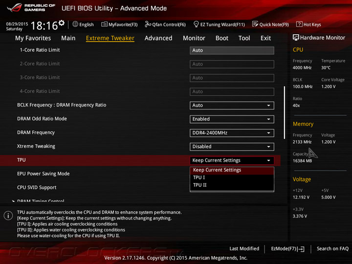 Прошивка Maximus VIII Ranger предлагает несколько наборов настроек повышенного быстродействия, которые находятся в подразделе Overclocking Presets. Кроме того, UEFI Setup позволяет выбрать один из двух профилей автоматического разгона TPU I и TPU II, эффективность работы которых будет оценена в практической части сегодняшнего обзора.