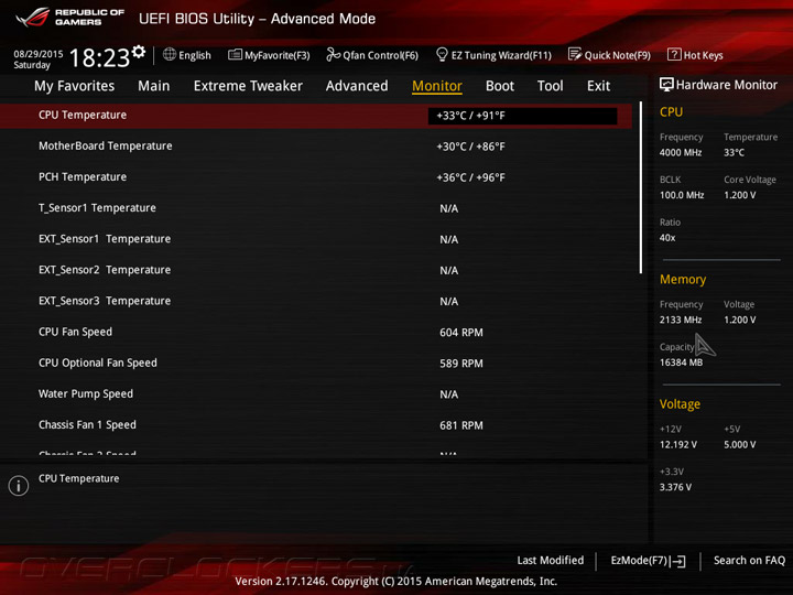 Функции аппаратного мониторинга и настройки режима работы вентиляторов можно встретить в разделе Monitor, где выводятся температуры с трех встроенных и четырёх внешних термопар, отображаются скорости вращения крыльчаток десяти охладителей и показания напряжений на процессоре и основных шинах питания.