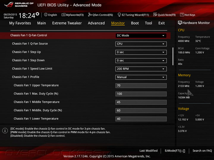 Управление скоростями вращения «карлсонов» находится в подменю Q-Fan Configuration. Для каждого из десяти вентиляторов можно выбрать один из трех встроенных профилей, либо задать режим работы вручную, связав обороты с показаниями одного из температурных сенсоров.