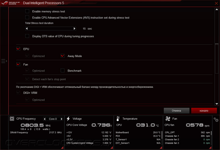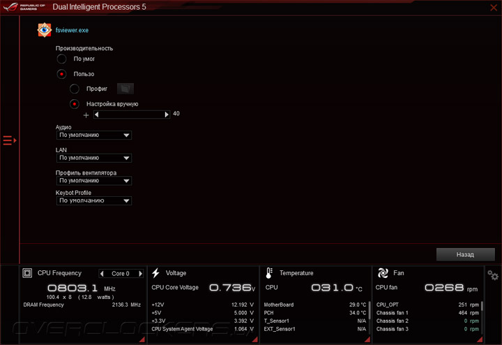 Компания ASUS уделяет повышенное внимание программной составляющей своих продуктов, и Maximus VIII Ranger не является исключением из этого правила. Вместе с материнской платой покупатели получают набор всех необходимых драйверов и целый ряд программного обеспечения, из которого любителей разгона наверняка заинтересует приложение Ai Suite 3. В его состав входят множество функциональных модулей, которые отвечают за управление быстродействием и режимом работы системы охлаждения, тонкую настройку подсистемы питания и реализацию дополнительных функций. В нижней части окна находится информационная панель, на которой выводятся показания системного мониторинга. После запуска программы по умолчанию открывается модуль Dual Intelligent Processor 5, который служит для оверклокинга, управления энергосбережением, настройки работы вентиляторов и многого другого.