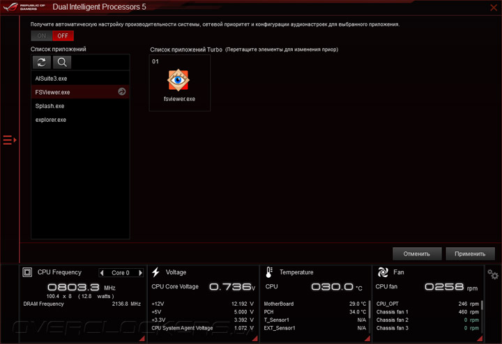 В состав Dual Intelligent Processor 5 входит утилита Turbo App, с помощью которой можно для каждого приложения выбрать профиль быстродействия, режим работы вентиляторов, сетевой и звуковой подсистем, а также программный модуль EPU, служащий для включения фирменных функций снижения энергопотребления.