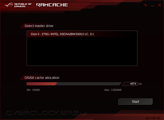 Одним из способов повышения отзывчивости и быстродействия системы является кэширование часто используемых данных с дисковых накопителей в специальной области ОЗУ. Для этих целей ASUS предлагает утилиту RAMCache, которая позволяет выбрать запоминающее устройство, а также указать объем оперативной памяти для хранения временных данных.