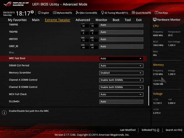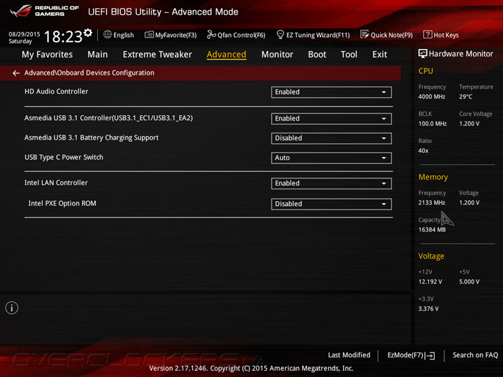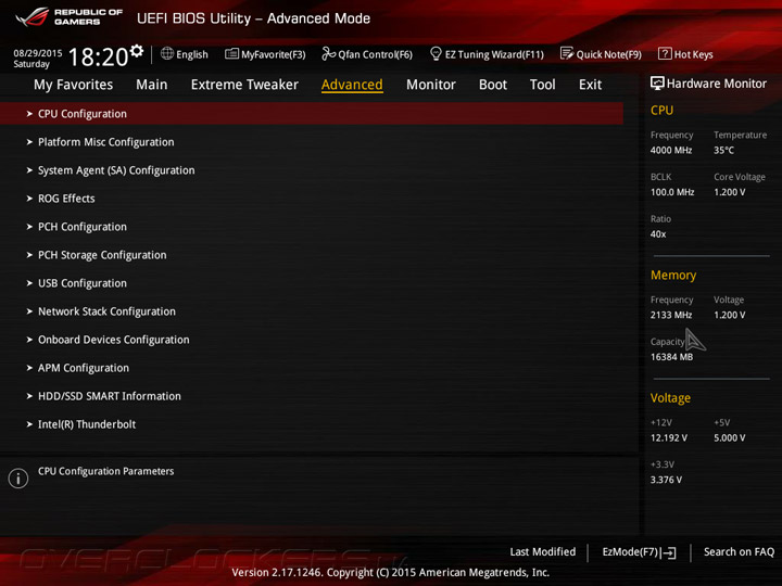 Системная плата Maximus VIII Ranger оснащена прошивкой на базе управляющего микрокода UEFI, интерфейс меню настройки напоминает о «материнках» ASUS семейства Republic of Gamers на базе чипсетов Intel 9-й серии. UEFI Setup предлагает два режима: упрощенный EZ Mode, который служит для базовой конфигурации системной платы, и расширенный Advanced Mode, предназначенный для тонкой настройки всех возможных параметров прошивки. В режиме EZ Mode пользователям предоставляется основная информация о режимах работы главных компонентов и выводятся показания аппаратного мониторинга. Кроме того, в упрощенном режиме можно включить профили X.M.P., задать дату и время, а также настроить режим работы вентиляторов.