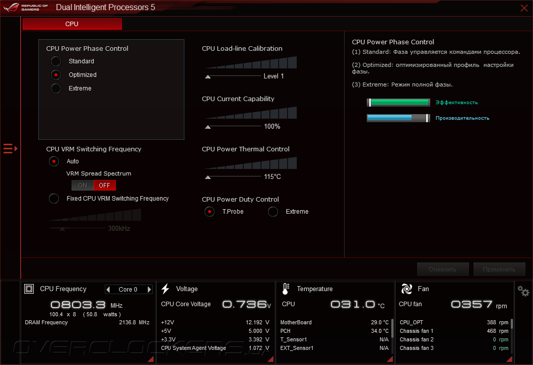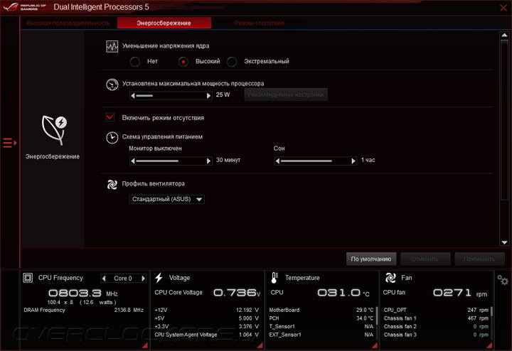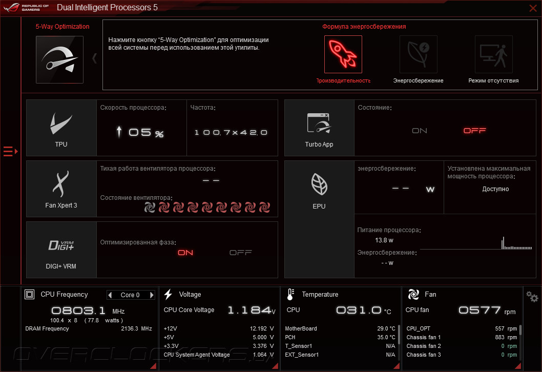 В состав Dual Intelligent Processor 5 входит утилита Turbo App, с помощью которой можно для каждого приложения выбрать профиль быстродействия, режим работы вентиляторов, сетевой и звуковой подсистем, а также программный модуль EPU, служащий для включения фирменных функций снижения энергопотребления.