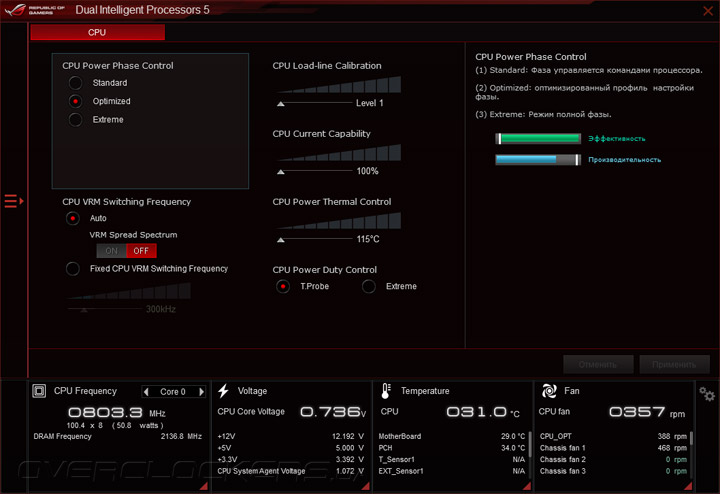 Подпрограмма DIGI+ VRM предназначена для настройки цифровой подсистемы питания, она позволяет регулировать работу функции Load-line Calibration, задавать частоту переключения силовых элементов и отключать неиспользуемые фазы преобразователя напряжения при минимальной нагрузке.