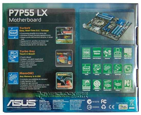 Упаковка не выделяется оригинальность дизайна, разве что в глаза бросаются обилие различных логотипов. Особенно акцентируется внимание на поддержке фирменных технологий TurboV, Turbo Key и кнопочке Memory OK (о назначении которой будет рассказано чуть ниже).