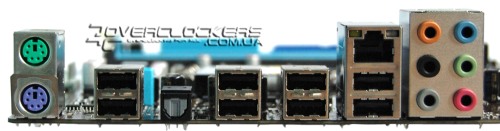 На заднюю панель вынесены два PS/2, восемь разъемов USB, один сетевой RJ-45, шесть аналоговых аудивыходов и цифровой оптический.