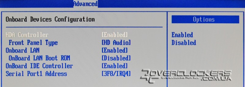В Onboard Devices Configuration находятся настройки контроллеров звука, сети, IDE и последовательного интерфейса COM.