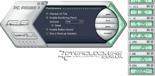 Утилита PC Probe II позволяет отслеживать данные мониторинга напряжений, температур и скорости вращения вентилятора. На отдельной вкладке отображается уровень загрузки оперативной памяти, процессора и распределение свободного места на HDD.