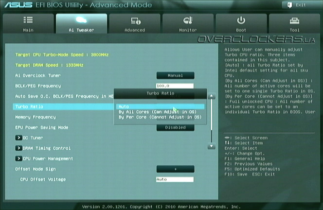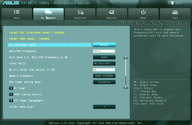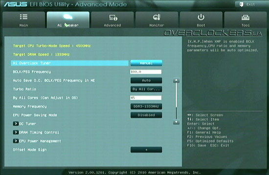 В разделе Ai Tweaker содержатся все основные опции, включая управление частотами и напряжениями. Встроенная функция Ai Overclock Tuner с ходу определяет турборежим для тестового процессора Core i7-2600K — 4,5 ГГц: