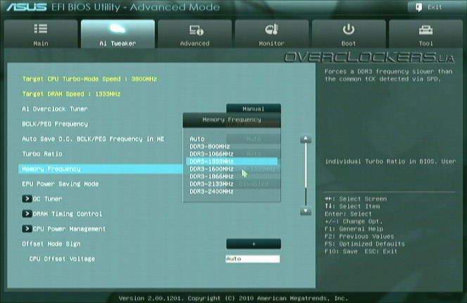 Режим работы памяти выбирается из ниспадающего списка. Доступны частоты от 800 до 2400 МГц (в официальных спецификациях на сайте ASUS прописано другое максимальное значение — 2200 МГц).