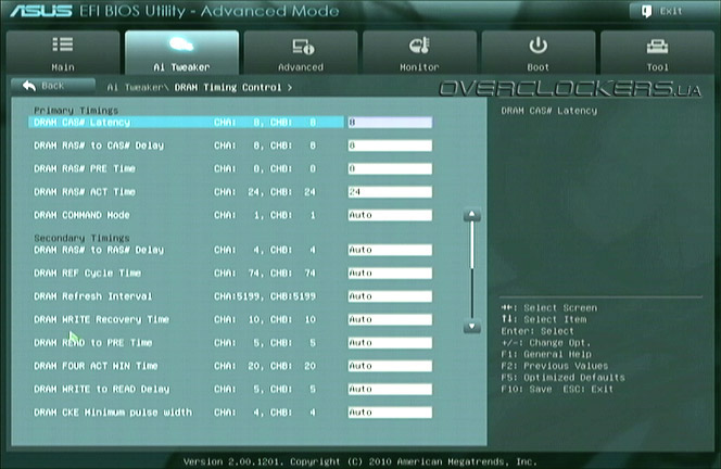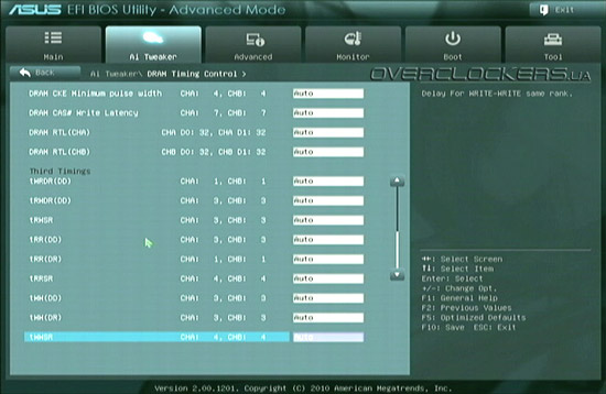 Тремя строками ниже находится подменю настройки задержек памяти. Окошки выбора таймингов соседствуют со столбцом, в котором отражены их текущие значения.