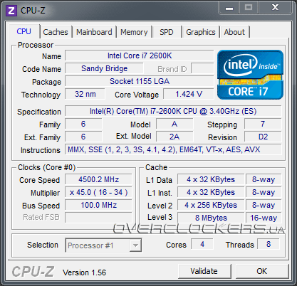 Как уже было отмечено выше, функция поднятия напряжения на процессоре в UEFI материнской платы ASUS P8P67-M Pro реализована неудачно, поэтому разгон четырехъядерника Intel Core i7-2600K производился в условиях автоматической регулировки Vcore. В итоге такой «любительский» подход позволил достигнуть стандартных для Sandy Bridge 4500 МГц при напряжении питания 1,42 В.