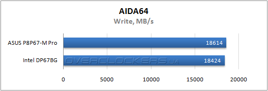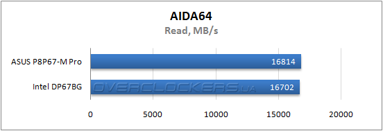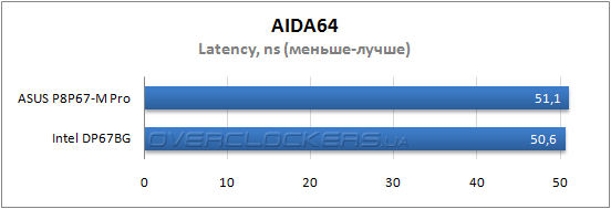 Соперники обменялись локальными успехами в Aida64 (Everest): плата ASUS оказалась существенно быстрее в тесте записи в память, а Intel — в тесте чтения. Латентность памяти также лучше у референсной DP67BG.