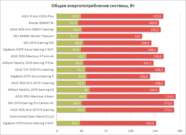 О нагреве уже было сказано не раз, достаточно лёгкого прохождения воздуха вдоль элементов VRM для бессбойной работы устройства (когда не активируется термозащита, граница которой находится где-то у отметки 105 °C). Цифры потребления рекордны для этого участка тестов, пределы составляют 35 и 188 Вт. Определённо, наличие механизма по управлению напряжением помогло бы совсем иначе подойти к проблеме высокого нагрева (и потребления). Величины достаточно близки к полученным на куда более крепкой ASUS ROG Strix B360-F Gaming.