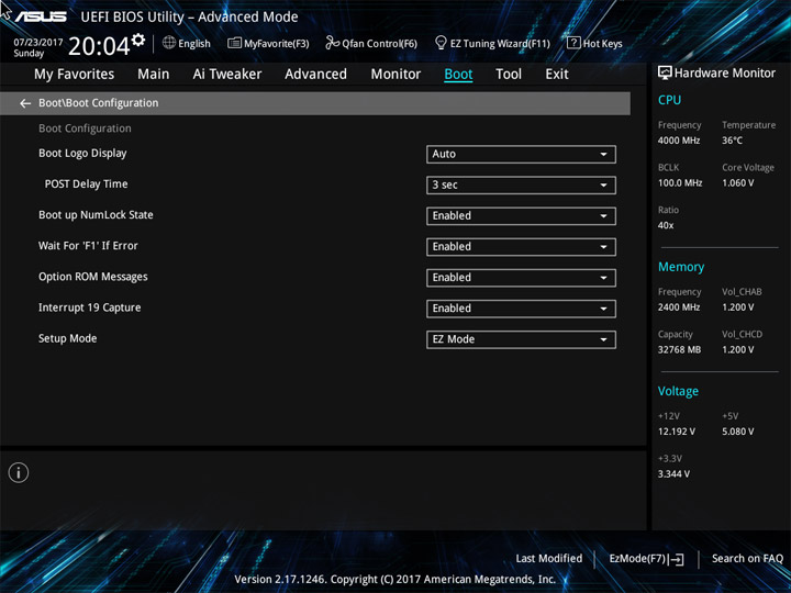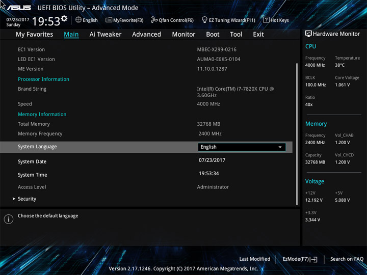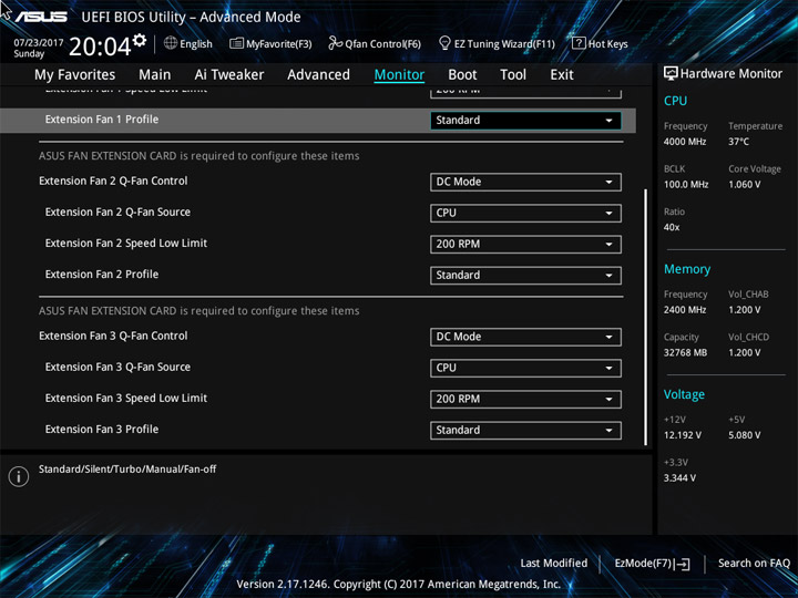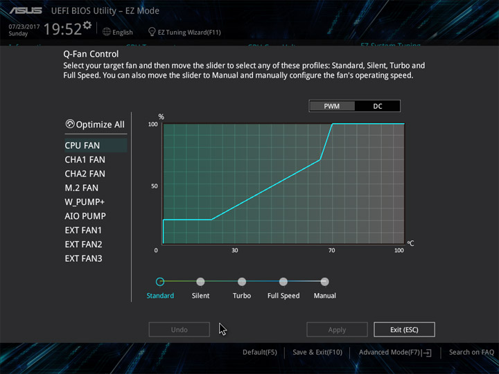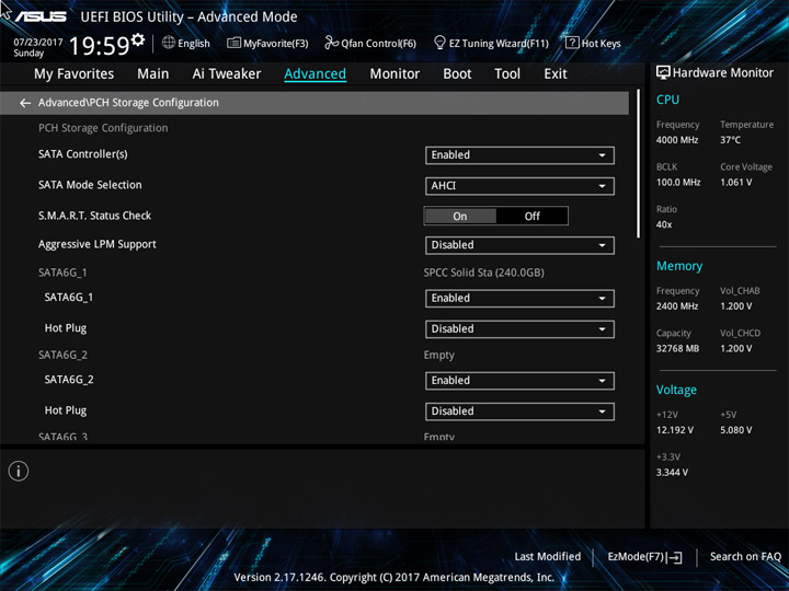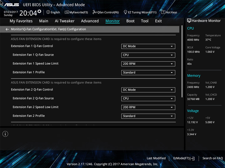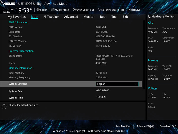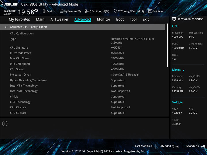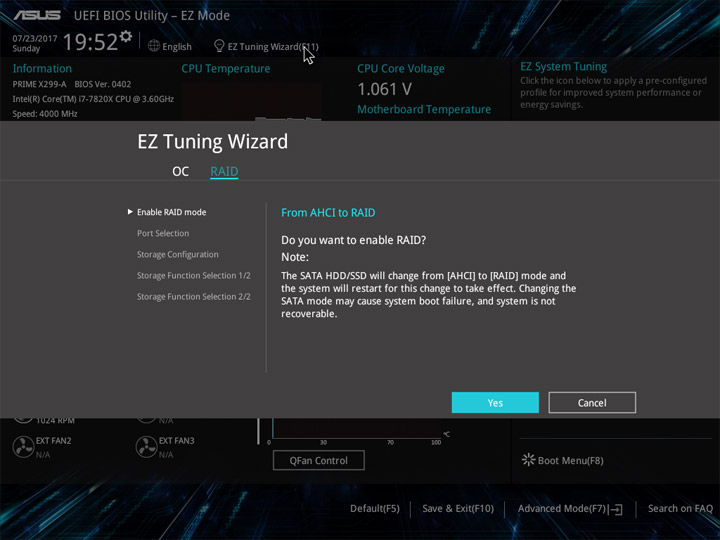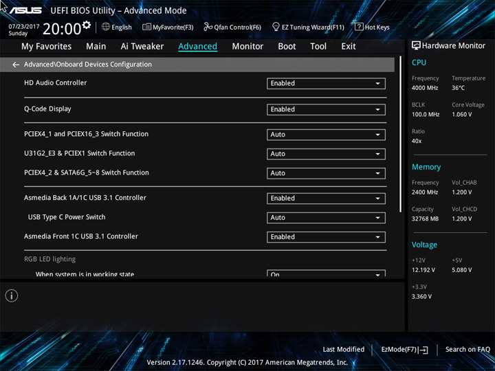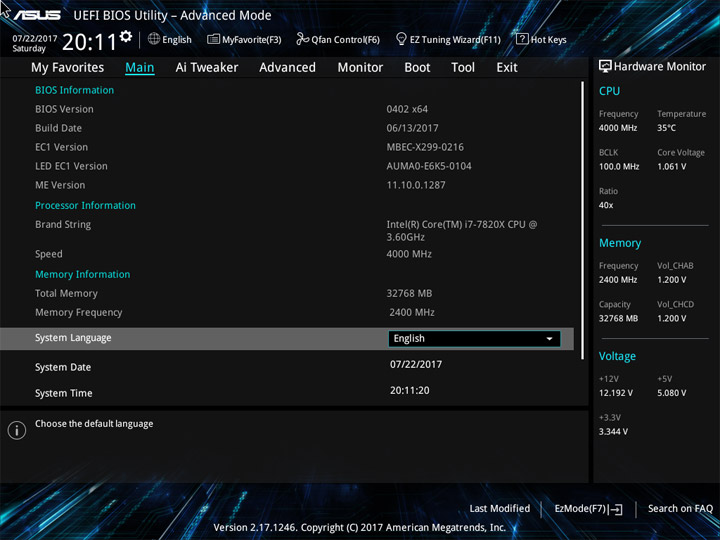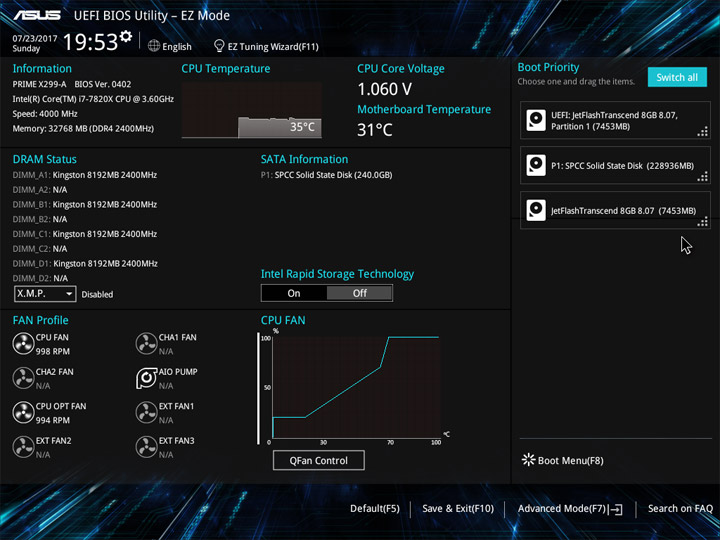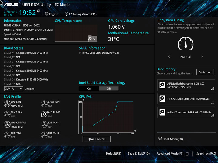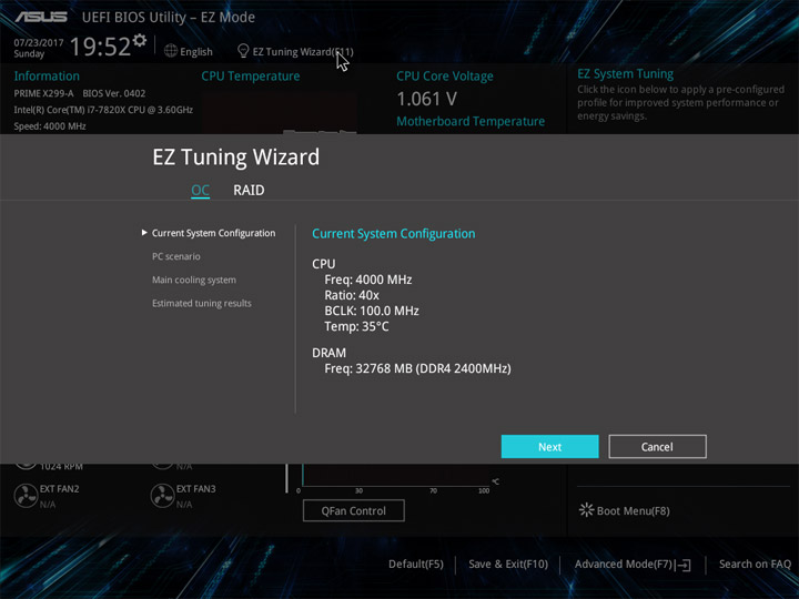 Структура и оформление интерфейса полностью совпадают с аналогичным наполнением плат для ЦП LGA1151. Имеется базовый и расширенный режимы по работе с настройками системы. Используя Ez Mode, можно установить время, активировать XMP, поработать с вентиляторами, заняться распределением приоритета среди загрузочных устройств. По нажатию F11 запустится мастер по автоматическому разгону и (или) по наладке схемы массивов RAID.