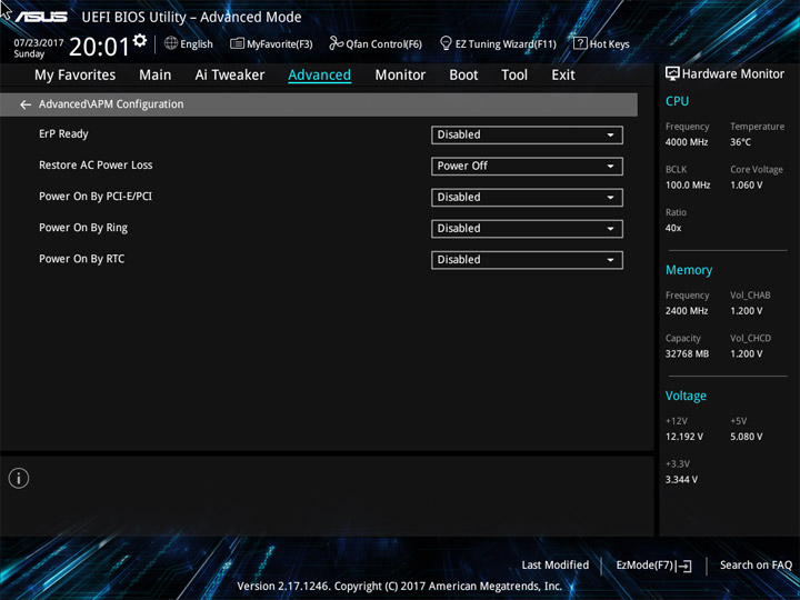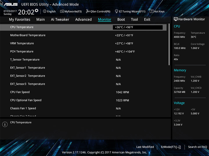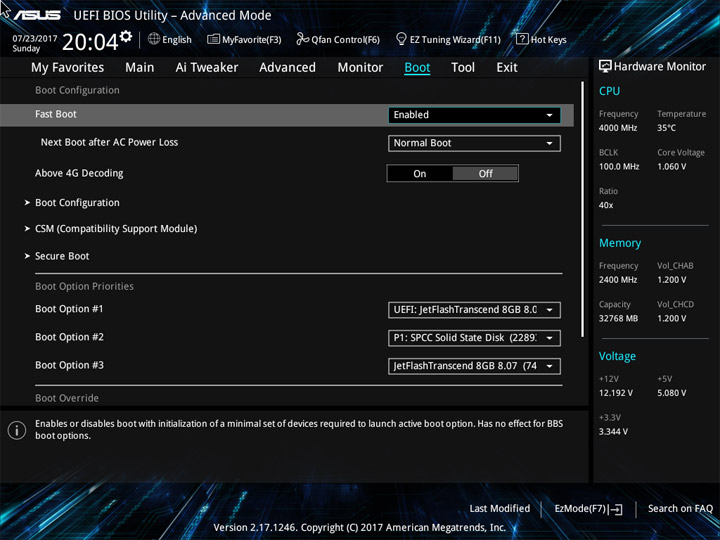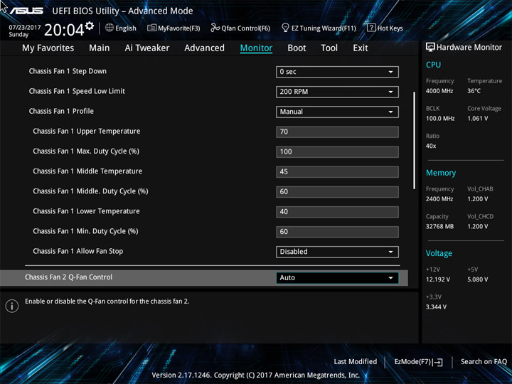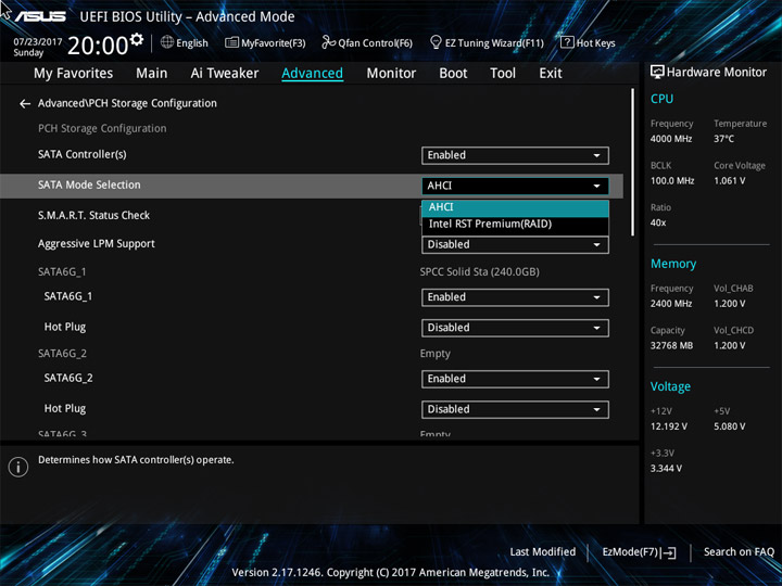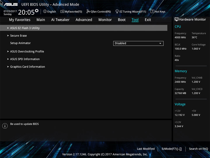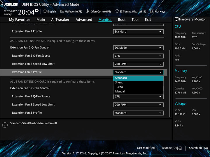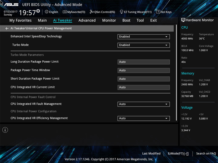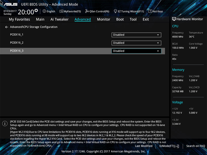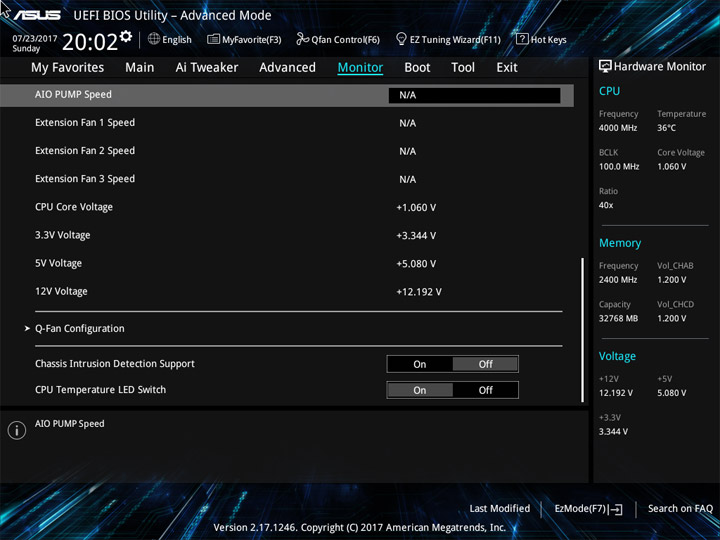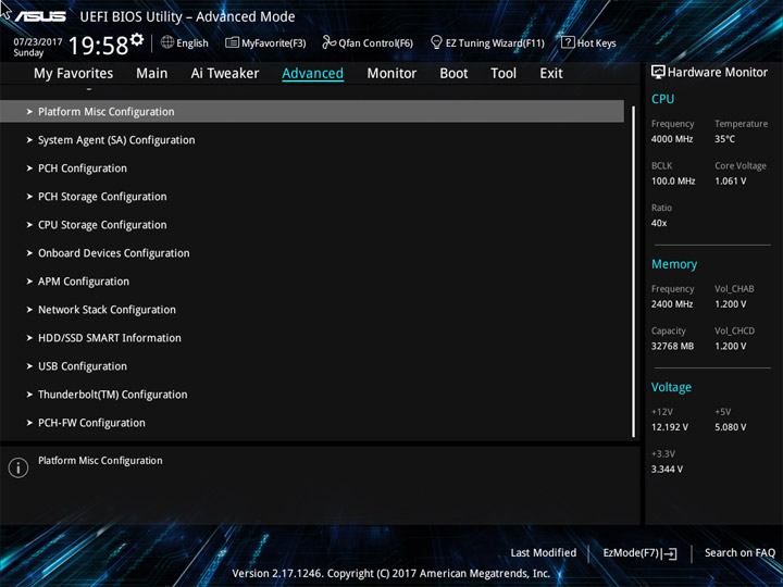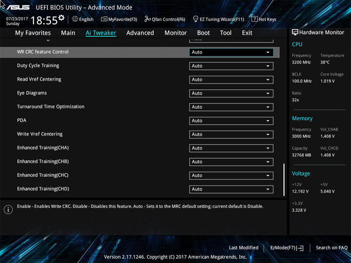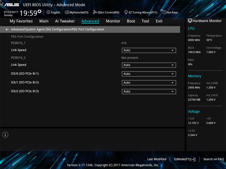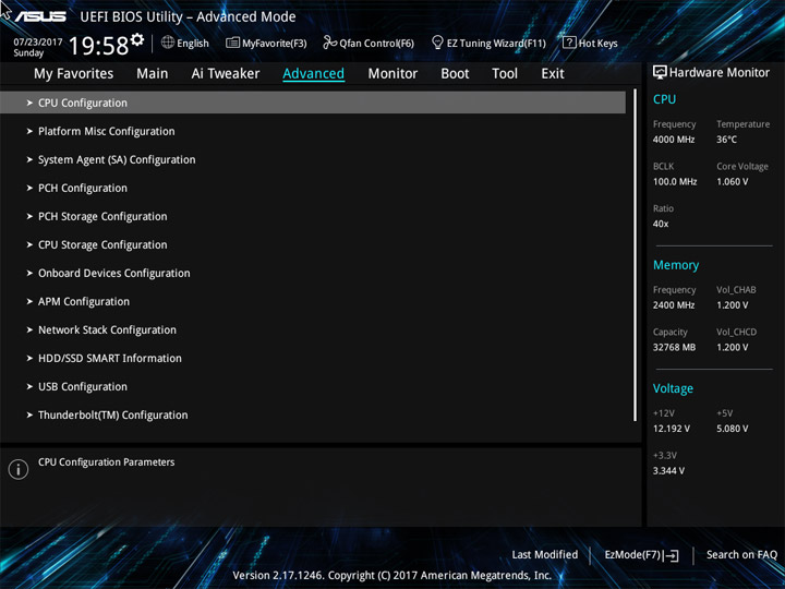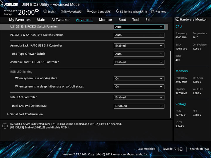 Структура и оформление интерфейса полностью совпадают с аналогичным наполнением плат для ЦП LGA1151. Имеется базовый и расширенный режимы по работе с настройками системы. Используя Ez Mode, можно установить время, активировать XMP, поработать с вентиляторами, заняться распределением приоритета среди загрузочных устройств. По нажатию F11 запустится мастер по автоматическому разгону и (или) по наладке схемы массивов RAID.