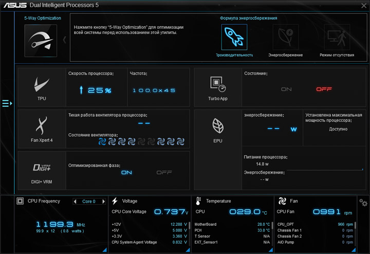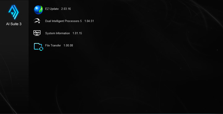 Центральным комплексом является Ai Suite 3, в его состав включён мастер по настройке системы Dual Intelligent Processors 5.
