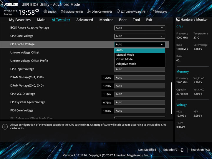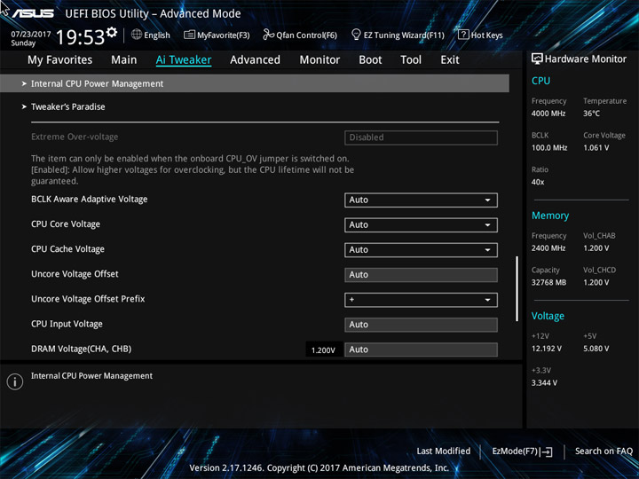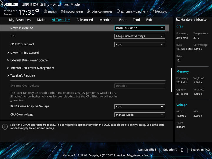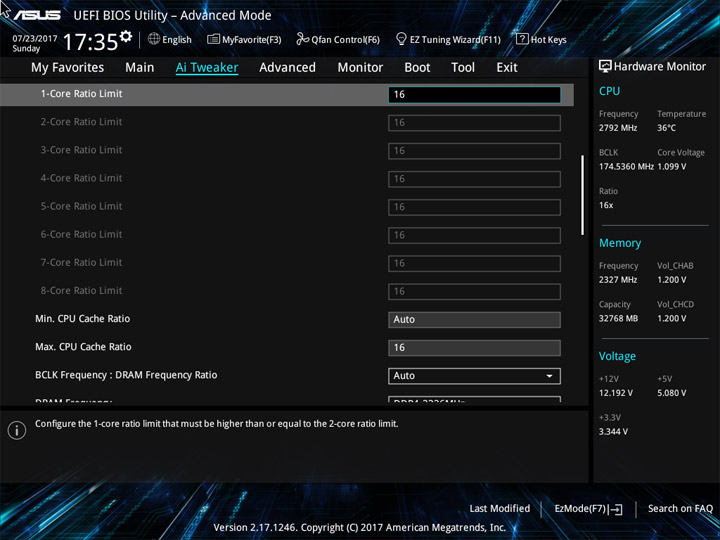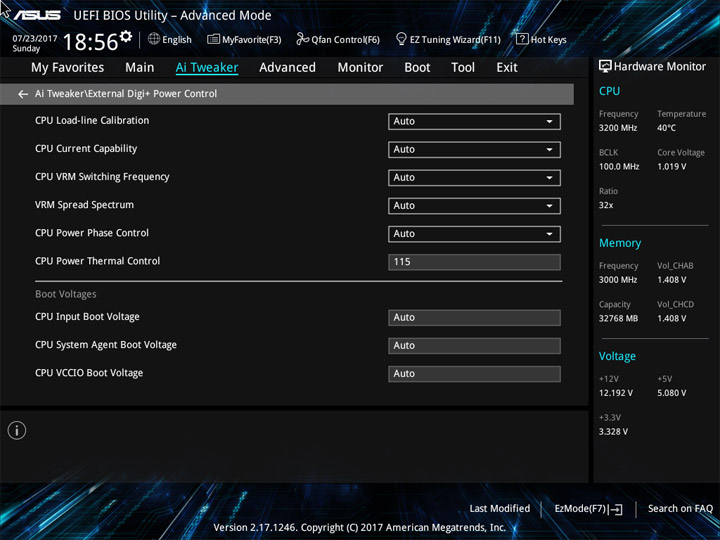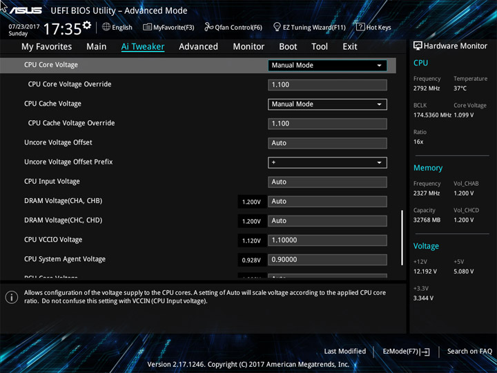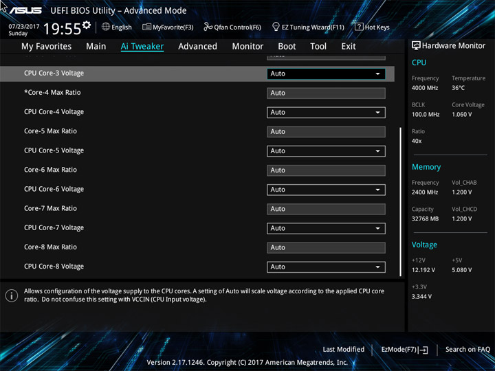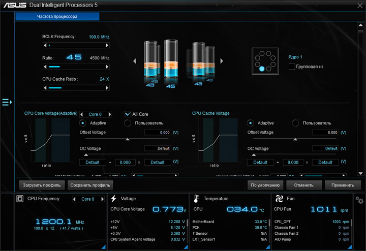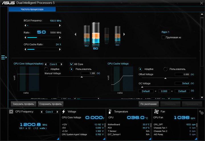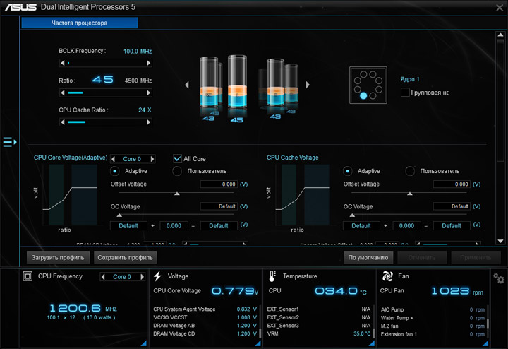 Ввиду возможного отличия величин напряжений на всех ядрах ЦП, реализацию наблюдения за этим параметром (в режиме реального времени) на странице Ai Tweaker, или где-либо ещё, не выполнили. Больше удивляет отсутствие мониторинга напряжения CPU Input как в UEFI, так и в среде ОС. Наличие восьми профилей LLC по достоинству оценить будет тяжело без возможности оценки их непосредственного влияния на переменную. Напряжение CPU Cache также окажется без внимания со стороны наблюдателя.