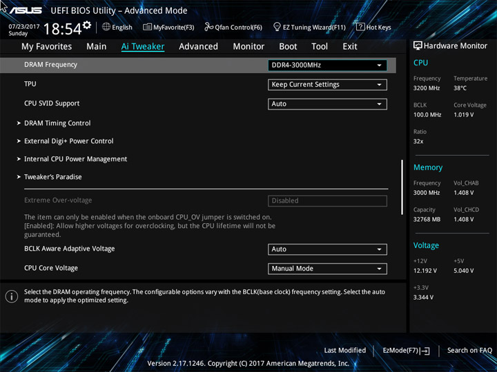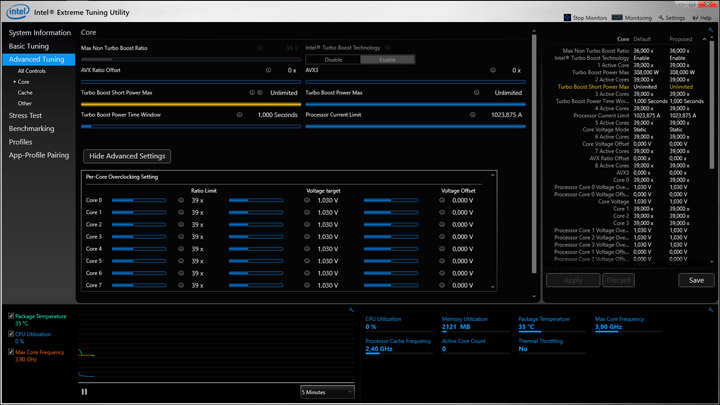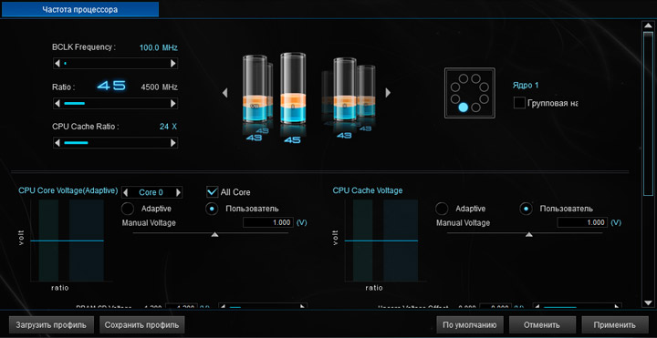 Платформа на базе Intel X299 предлагает до сих пор невиданную гибкость при взаимодействии с каждым отдельным ядром. Можно не только указать нужный множитель, а и необходимое напряжение. Для случаев использования AVX-инструкций допускается применение двух разных понижающих множителей. Идеальным решением оказалось бы ещё и внедрение механизма для понижения в такие моменты напряжения. Высокие частотные отметки при разгоне обычно сопряжены с необходимостью повышения напряжения, а такой единожды повышенный уровень компенсация множителя (для сценариев с использованием AVX) уже не сможет нивелировать, в результате чего будет неизбежно активироваться механизм защиты (троттлинга). Поэтому, на данный момент, пользователю придётся или точно определиться со сценариями текущего использования ПК, или идти на определённого рода компромиссы при желании получить универсальный, единожды настроенный для работы компьютер. Для настоящего энтузиаста есть огромное поле для экспериментов. Особо ценным станет возможность сохранять наработки в профилях, подобные возможности уже реализованы как в утилитах, так и в UEFI.