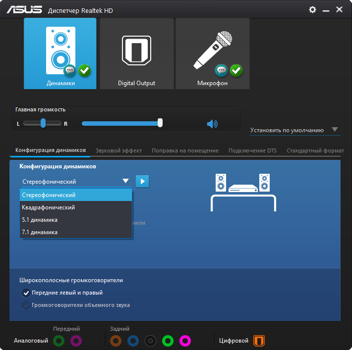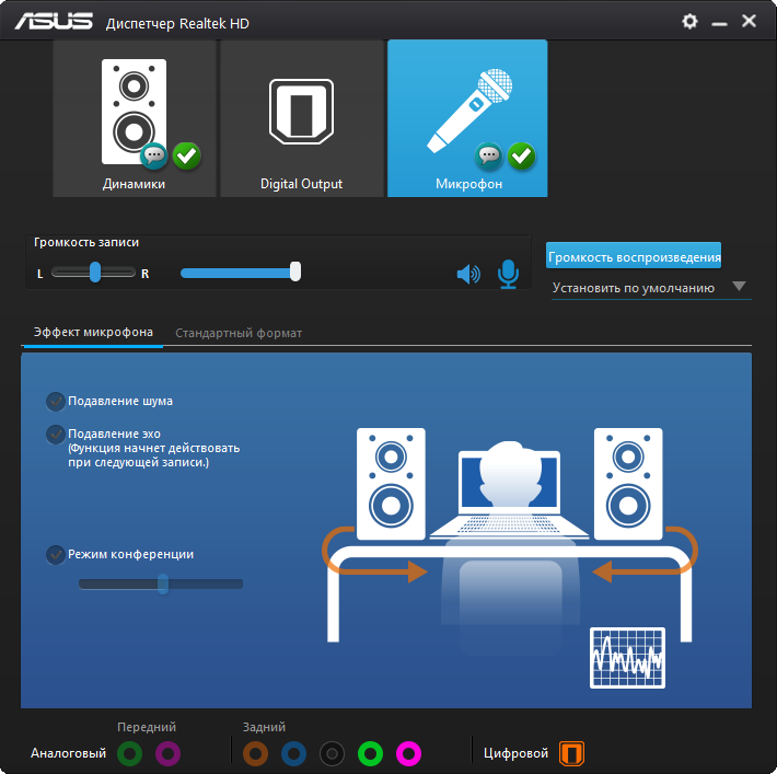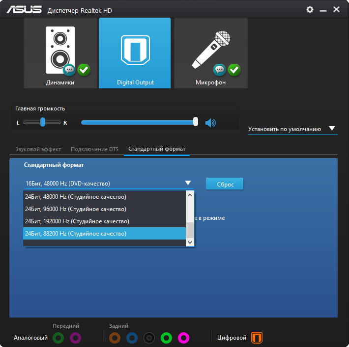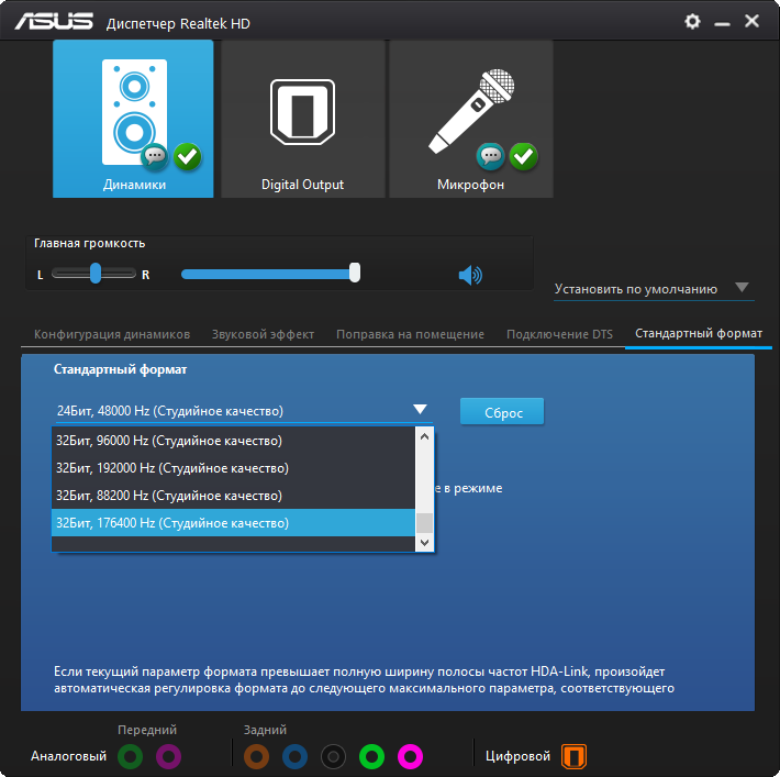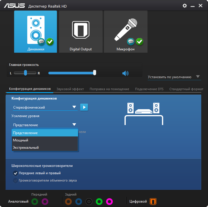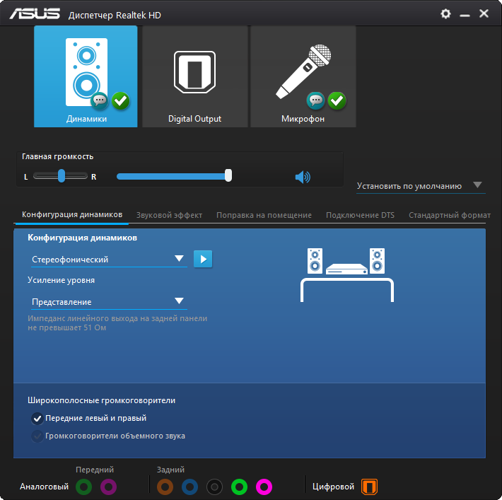 Организация работы звуковой части возложена на конфигуратор от Realtek. Есть известные по последним моделям способы изменения звукового материала — три профиля предусиления и выбор среди типов подключенного оборудования. На других моделях плат, где используются ОУ, они достаточно уместны, но в этот раз особого улучшения или заметного изменения звучания не последовало. Сам звук был достаточно зажатым в области НЧ и неуверенным в диапазоне ВЧ. Для хороших звуковоспроизводящих устройств потребуется как минимум усилитель.