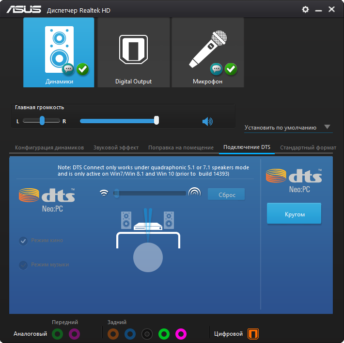 Словно прочувствовав ситуацию, специалисты компании ASUS предлагают в комплекте бонусное ПО для достижения бóльших успехов, если самостоятельная работа с эквалайзером кого-то смущает. В среде DTS Audio есть и профили оборудования, и схемы его использования, также можно выполнить акцент на одной или нескольких составляющих звука. Впрочем, ожидать радикального исправления подачи материала не стоит по уже названным выше причинам.
