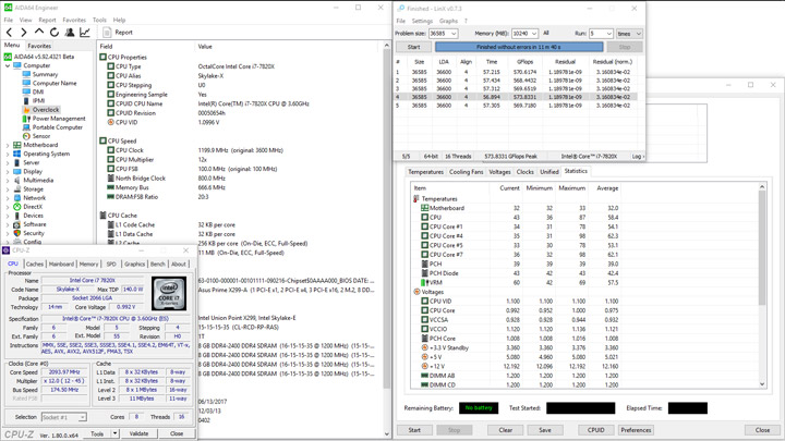Свежий модельный ряд продуктов обзавёлся также и новой версией AVX, имеющей вместо напрашивающейся цифры «три» броскую трёхзначную величину — 512. По опыту работы с другими процессорами Intel точно известно о значительном росте температуры в случае привлечения подобных вычислительных способов. Проверим, что получится с последними библиотеками (Intel Math Kernel Library Benchmarks 2017.3.020), выступающими основой для работы LinX 0.7.3. Объём памяти был равен 10 ГБ, проводилось пять циклов замеров.