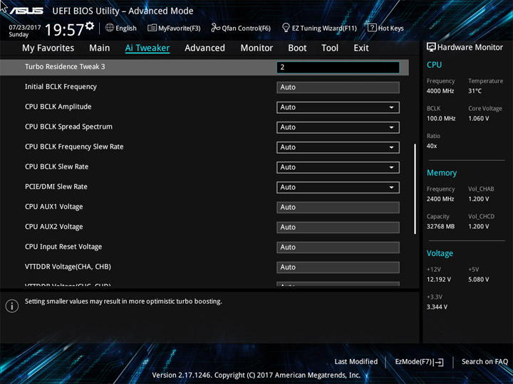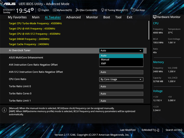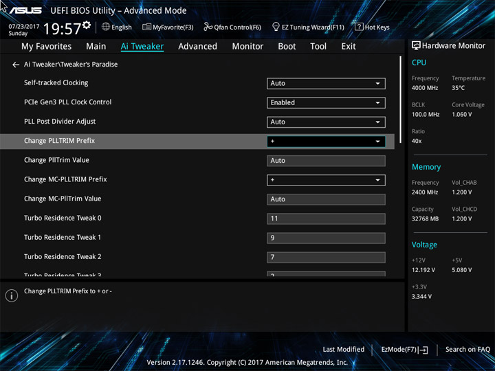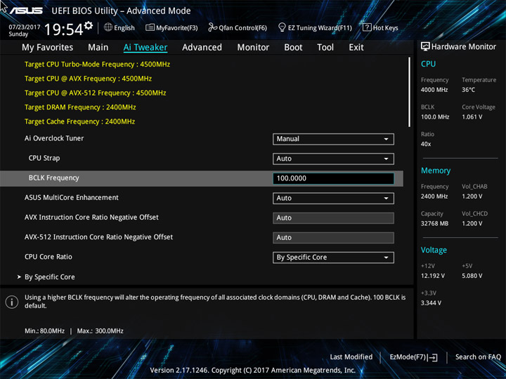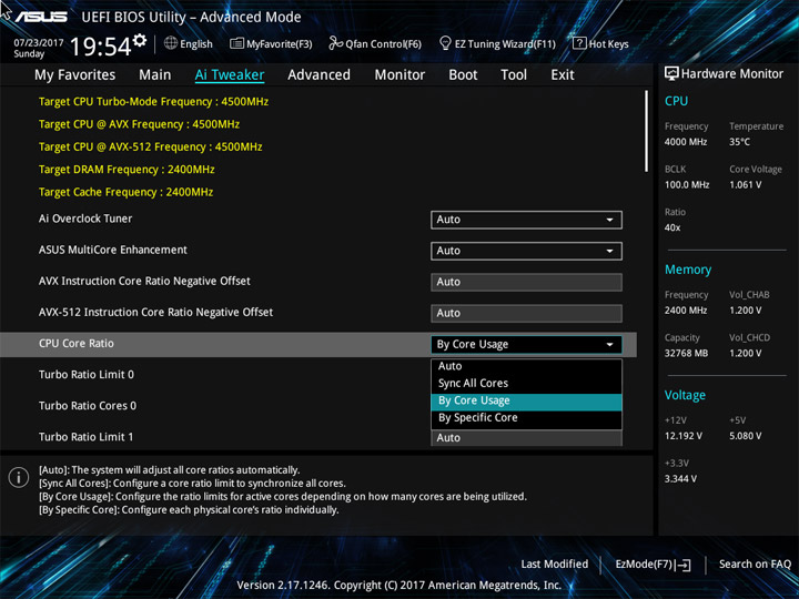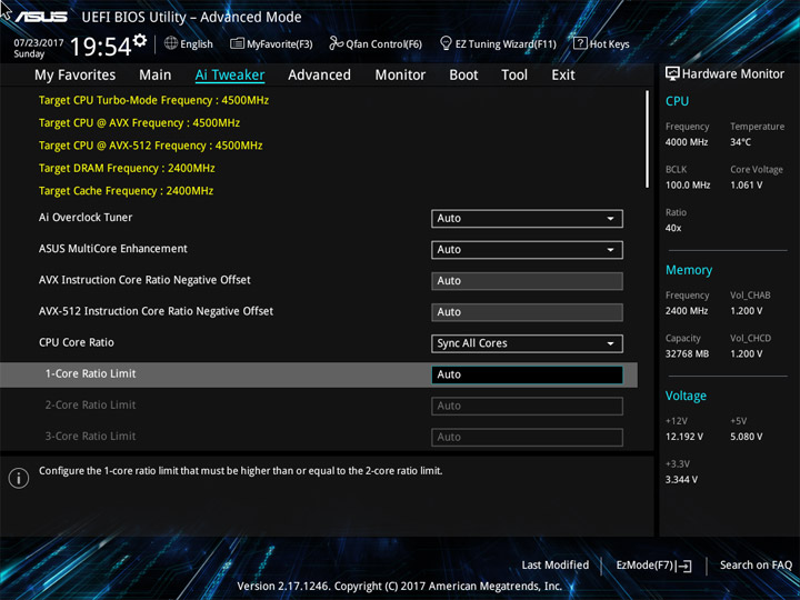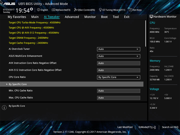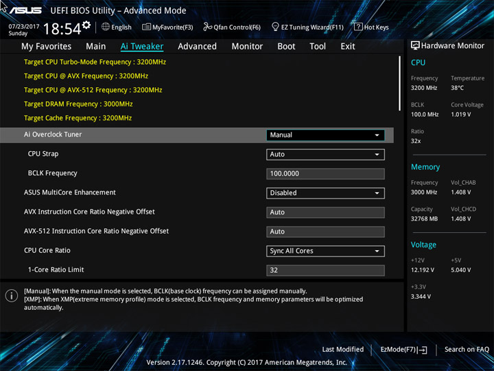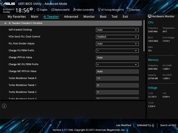Для проведения разгона предусмотрен раздел Ai Tweaker. Внимая его названию, можно охарактеризовать разгон как тонкую настройку системы. И поработать будет над чем. Теперь есть понижающий коэффициент для разных версий AVX. Прежде, при небольшом числе ядер, разгонять ЦП по одной формуле было просто. Их увеличение привело к тому, что теперь каждое можно отладить отдельно, а если не хочется персонально и поочерёдно изучать разгонный потенциал всех — можно просто переосмыслить схему Turbo Boost, обычного способа ускорения системы.