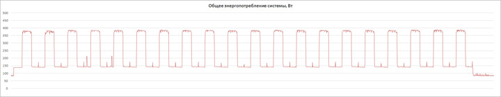 Тестирование системы с разогнанной памятью стало самым серьёзным испытанием для системы. Прогрев участка VRM был наибольшим, датчик демонстрировал значение 70 °С. Потребление энергии стендом тоже оказалось самым высоким, на пике отметка равнялась 390 Вт, а в простое замеры показали 81 Вт.