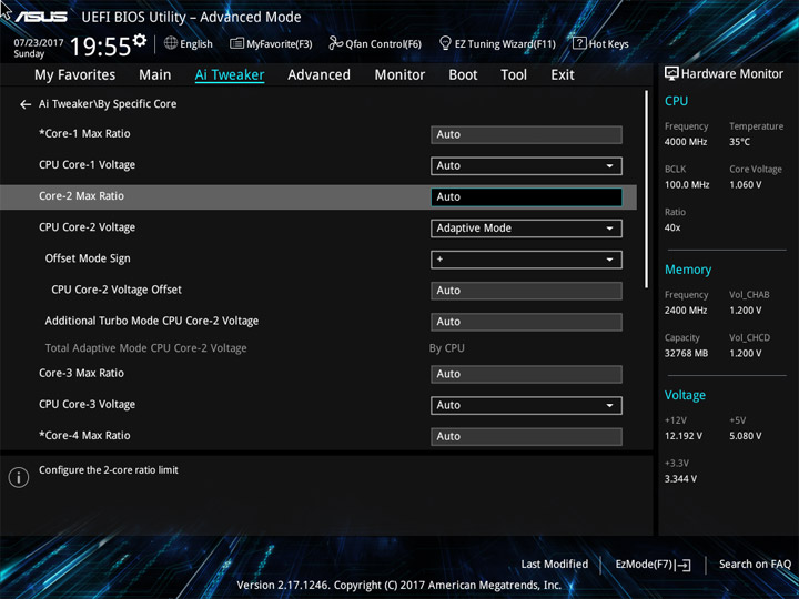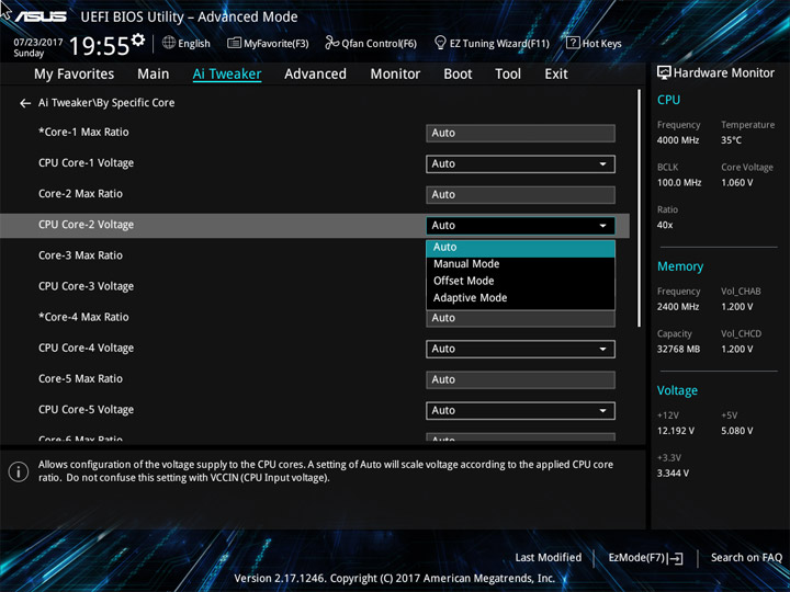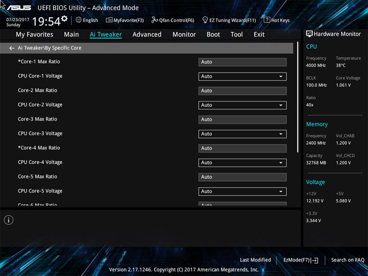 Говоря про индивидуальную настройку любого ядра стоит упомянуть возможность как компенсации напряжения (offset) так и его фиксации на определённом уровне, то есть указать можно не только множитель. Ядра, обозначенные звёздочками, являются наиболее удачными с точки зрения инженеров Intel, метку они получают ещё при изготовлении процессора. Не смотря на простой статус изделия, ASUS оснастили рассматриваемый продукт категорией Ai Tweaker, где находятся настройки, позволяющие выжать из системы большее, они пригодятся при разгоне высокого класса.