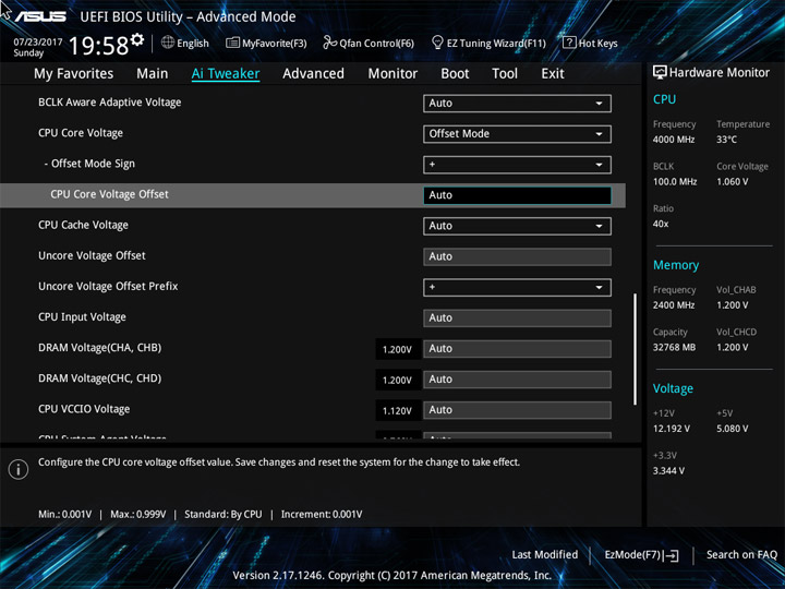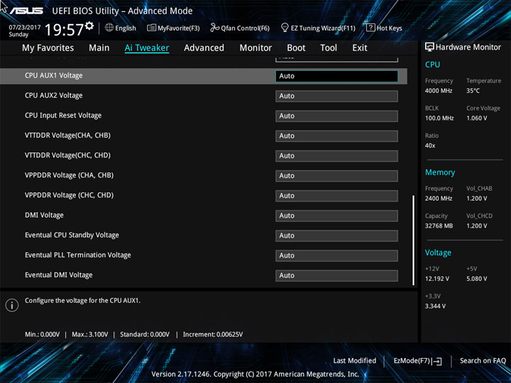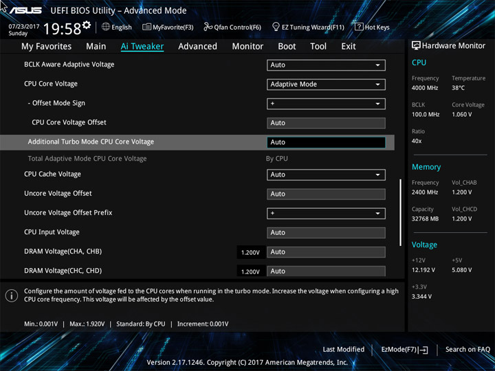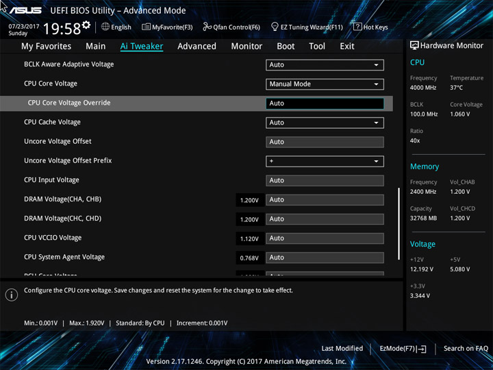 | CPU Core Voltage Override (В) | 0,001–1,92 | 0,001 |