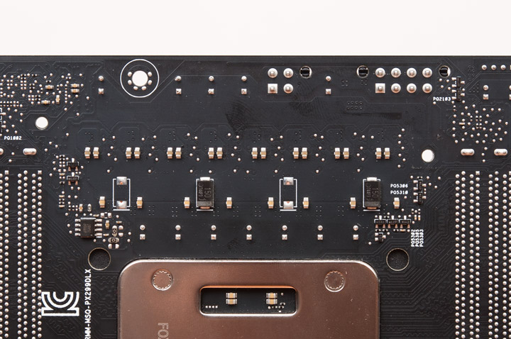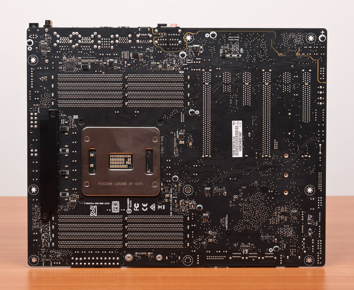 Немалое число элементов есть на обратной стороне. Среди них нет светодиодов, все они находятся на лицевой части устройства. Для системы стабилизации напряжения процессора добавлен защитный (усиливающий) радиатор в виде пластины. В середине сокета предусмотрено отверстие под термопару для процессора.