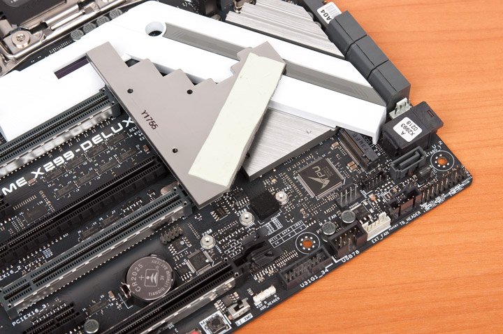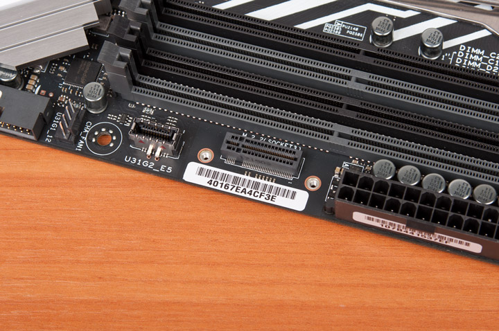 Более габаритные PCI-E устройства формата M.2 могут быть прикреплены к кронштейну, он идёт в комплекте с платой. Симметричное гнездо для корпусного кабеля USB 3.1 Gen2 работает от контроллера ASMedia.