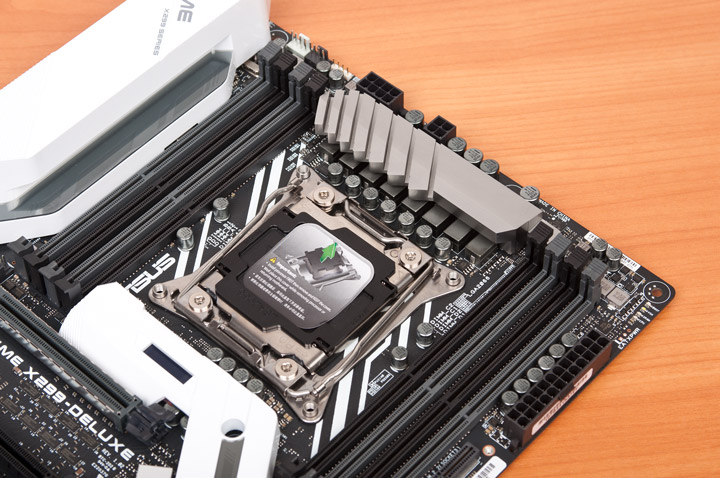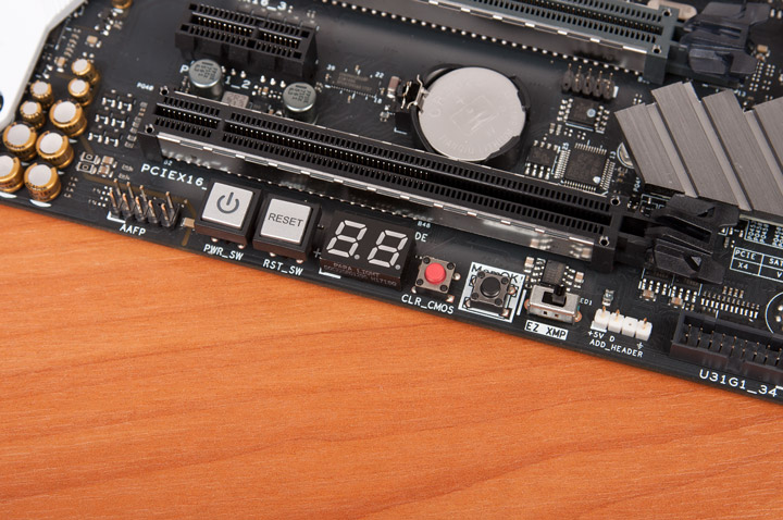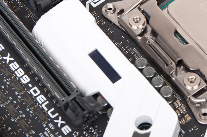 Между верхним гнездом под видеокарту и сокетом находится миниатюрный дисплей типа OLED. Он может показывать, например, частоту или температуру процессора. Понятнее о его возможностях станет в рубрике о программном обеспечении.