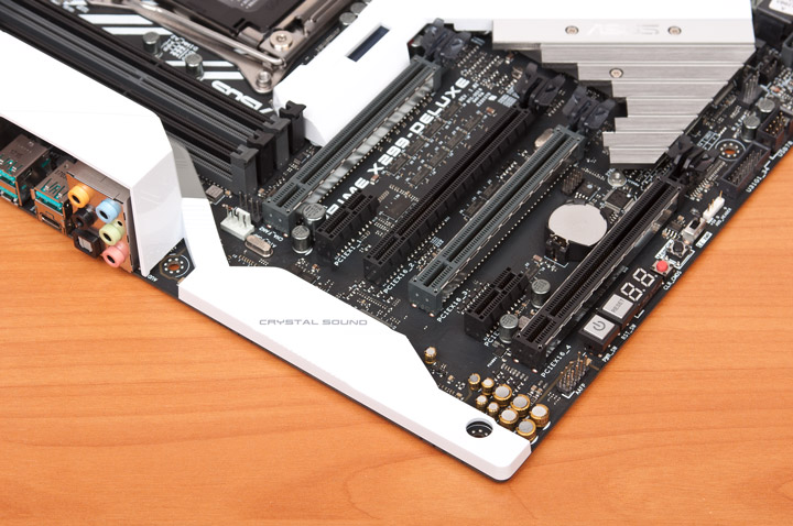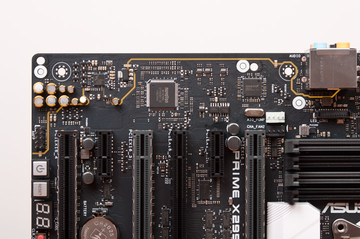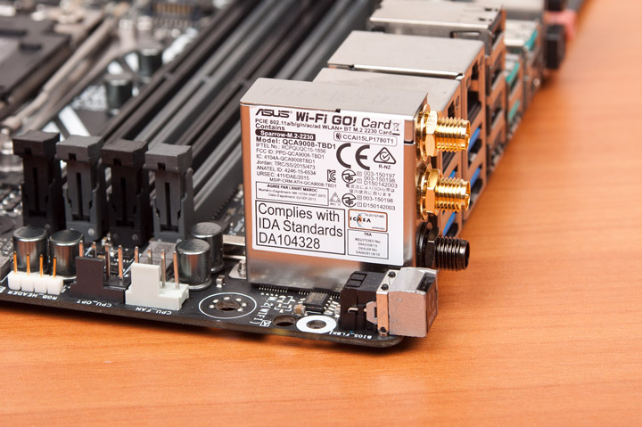 Звуковая подсистема начитывает старший кодек ALC1220 от Realtek специальной версии, созданной для решений от ASUS. Ни единого ОУ я не увидел. За стойкой с аудиовыходами есть гнездо, используемое для создания иллюминации сквозь окошко, изготовленное в козырьке вдоль всей задней панели.