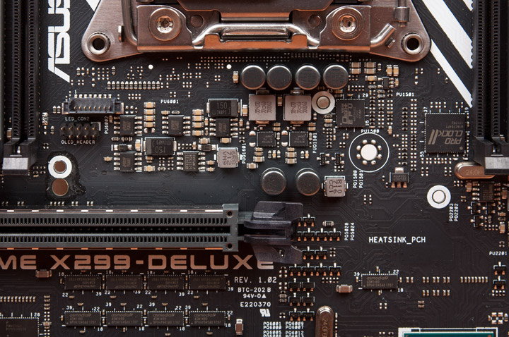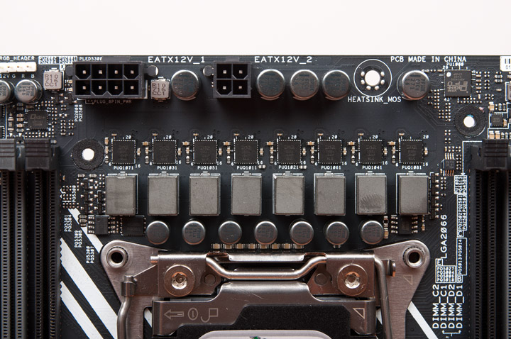 Организация околосокетного пространства равноценна модели Prime X299-A. Выделить можно использование «армейских» конденсаторов, свойственных продуктам высокого класса.