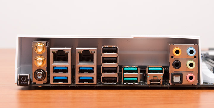 Задняя панель укомплектована намного щедрее, чем у базовой модели. Три гнезда под антенны от адаптеров(а) беспроводных сетей, два — для кабелей адаптеров Ethernet. Четыре выхода USB 2.0, четыре — USB 3.1 Gen1 и ещё четыре (включая симметричное) — USB 3.1 Gen2. Оптический выход и пять традиционных для аудиоразъёмов. Не хватает, разве что, PS/2, но для современной платы (2017 года выпуска) назвать это минусом будет слишком грубо. Единственная кнопка понадобится для восстановления прошивки посредством технологии USB BIOS Flashback.
