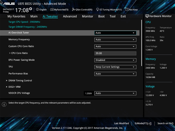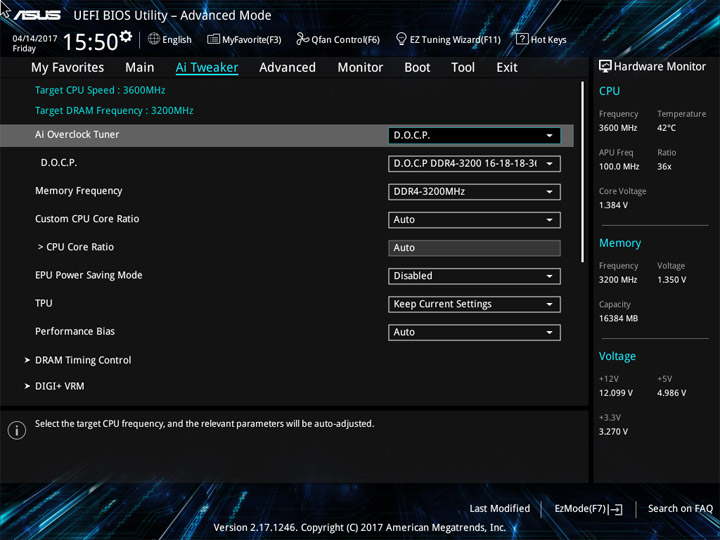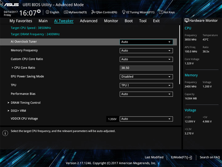 Итак, подобрав комплект памяти, можно изучить потенциал нашего экземпляра Ryzen 7 1800X. Любопытно посмотреть на готовые профили TPU. Первый предлагает совершенно скромный разгон — 3850 МГц.