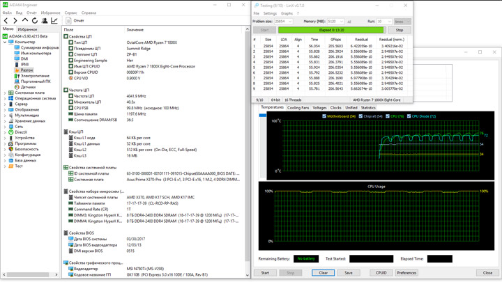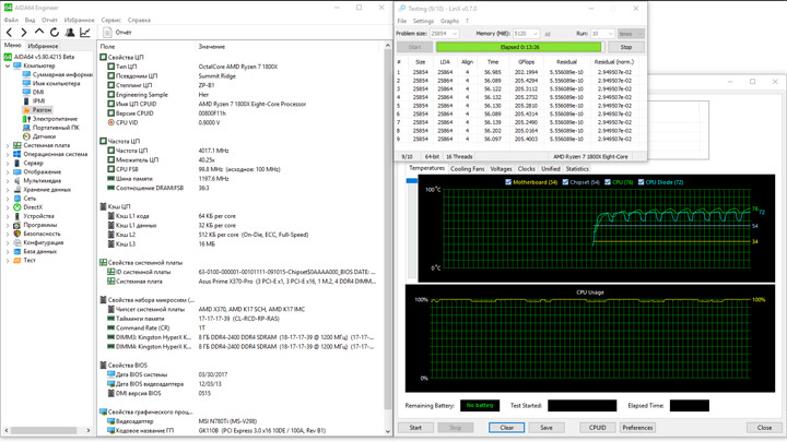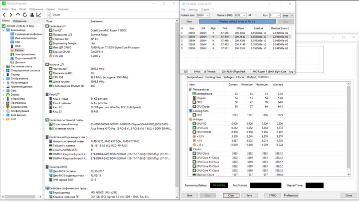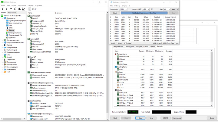 Перед тем как приступить к собственноручному разгону, необходимо определиться с приложением, которое будет констатировать стабильность в выбранном режиме работы ПК. Prime95 оказывает слабую нагрузку на систему, что проявляется как в температуре компонентов, так и в потреблении энергии. Отличной «грелкой» для плат и процессоров Intel является фирменный Linpack, а для упрощённой работы с ним оверклокеры привлекают простую графическую версию — LinX. Нативной поддержки AMD там нет, но существуют модифицированные версии, именно такую я и буду использовать. Некоторая часть аудитории недоверчиво относится к ней именно как к индикатору стабильной работы системы. Как я не старался, а заработать Ryzen 7 1800X на частоте 4050 МГц не заставил. Хотя работала и Windows, и большая часть программ.