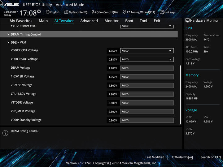 На этапе первоначального знакомства с ASUS Prime X370-Pro в распоряжении у меня было два разных комплекта на базе Samsung E-die с номинальными частотами (записанными в XMP) 2800 и 3200 МГц. Никакими способами я не мог заставить работать даже единственную планку на скорости 2666 МГц — сразу после сохранения настроек плата выдавала три коротких сигнала и уходила в циклическую перезагрузку. Последняя прошивка на момент написания обзора — 0604 — улучшила поведение устройства, 2666 МГц покорились обеим наборам без особых усилий. Однако больших частот добиться не получилось.