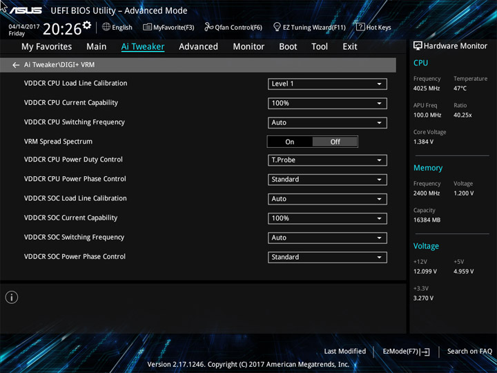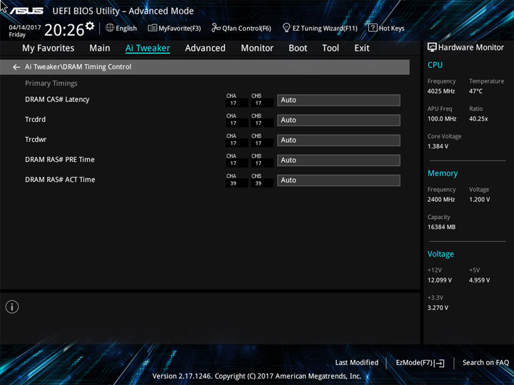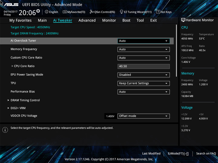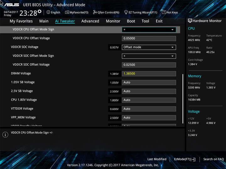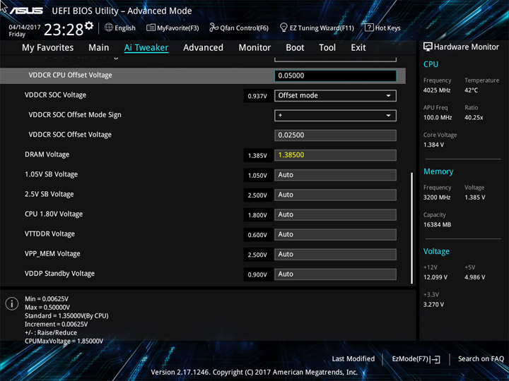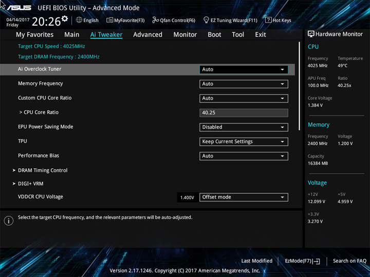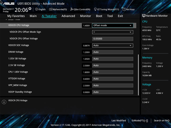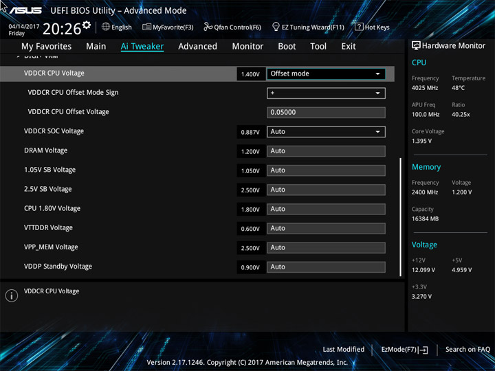 Пришлось снизить частоту ЦП до 4025 МГц. Такое значение я могу смело называть стабильным. Большого напряжения не понадобилось, достаточно прибавить 0,05 В к штатному для результирующих 1,4 В.