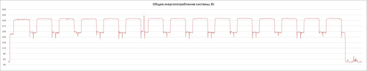 Замеры выполнялись после прохождения всех прочих тестов в «устоявшемся» режиме компьютера при помощи прибора собственной разработки. Для создания нагрузки использовался профиль In-place large FFTs в составе утилиты Prime95 (28.10). Производился расчёт среднего значения потребления тестового стенда «от розетки» на протяжении восьми минут работы программы, а затем, после завершения теста, ещё минуту замерялся уровень, соответствующий состоянию простоя системы.