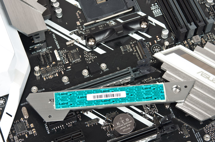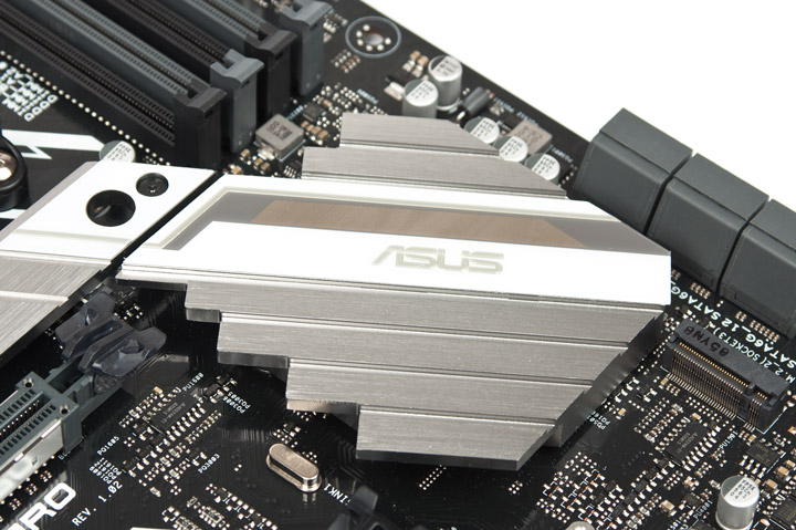 Верхнее посадочное место под устройства M.2 оснащено охладителем немалых размеров. Там можно будет смонтировать в том числе и продукты формфактора 22110.