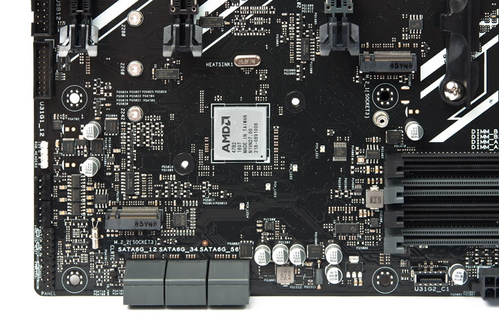 Идеологически схема организации стабилизации питания осталась неизменной. Перемаркированный ШИМ-контроллер ASP1405I обеспечивает работу VRM по схеме 6+2 фазы. Для подсистемы SOC Voltage имеется два удвоителя IR3599, потому итоговое число каналов будет равно четырём. Сменились силовые элементы. Здесь распаяны десять сборок (с интегрированным управляющим драйвером) IR3553. Такое же число (шесть штук) используется для стабилизации питания процессора в уже испытанной ASUS ROG Strix B450-I Gaming, а она вполне успешно справилась с разгоном старшего процессора. Проверим поведение этой модели чуть позже.