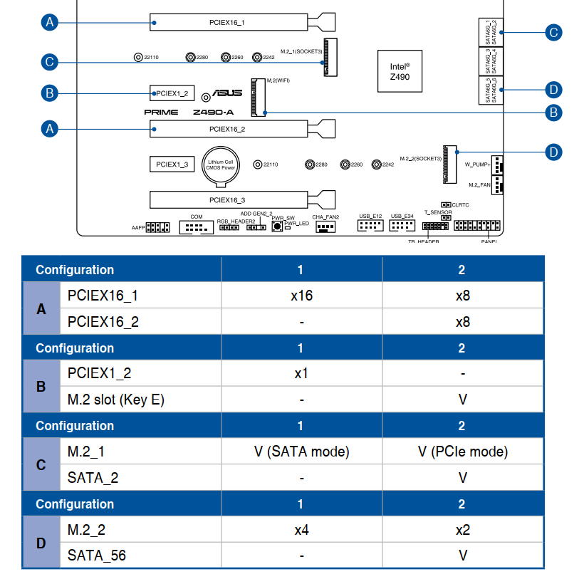 | Слоты PCI-E | 2 x PCI Express 3.0 x16 (x16+x0, x8+x8) — CPU 1 x PCI Express 3.0 x16 (x4) — Z490 3 x PCI Express 3.0 x1 — Z490 |