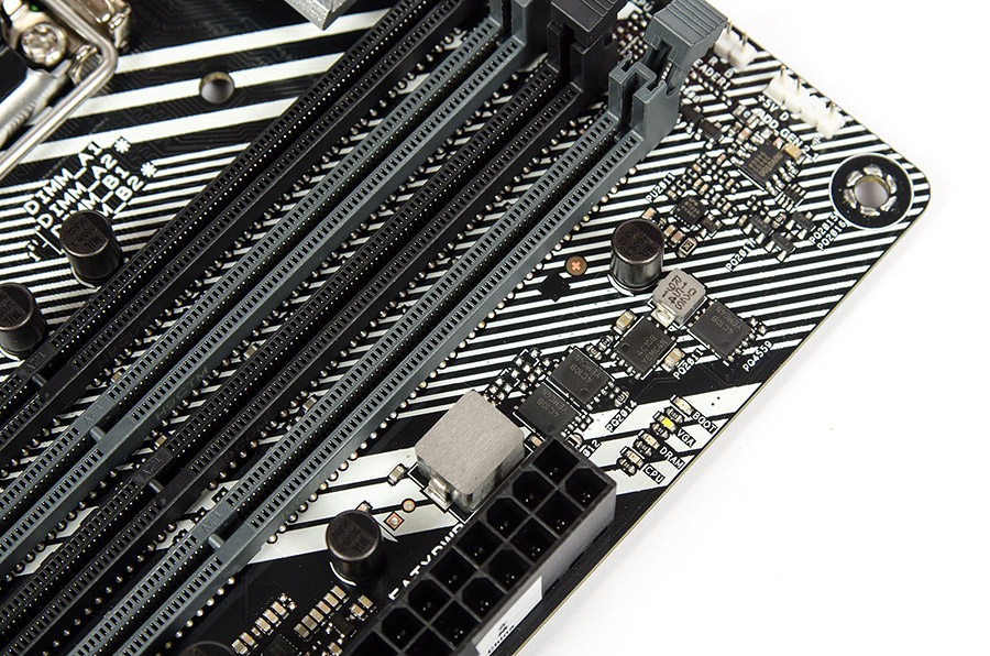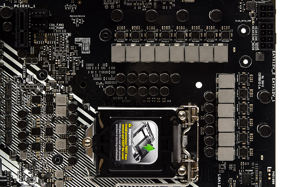 Перемаркированный ШИМ-контроллер обновлён до версии ASP1900B, он имеет 52 вывода. Продукция ON Semiconductor в лице 14 штук NCP302045 является сердцем стабилизатора: два необходимы для напряжения iGPU, остальные 12 будут формировать CPU Voltage. Внешних удвоителей фаз нет, а значит использовали приём удвоения элементов в составе каждой фазы, которых для основного напряжения получается шесть штук. Вокруг есть большое число конденсаторов «военного» класса надёжности, а срок стабильной работы на повышенных температурах тут составляет традиционные пять тысяч часов. Ниже сокета находится участок для формирования напряжений SA и IO. Первое базируется на однофазном ШИМ-контроллере Richtek RT9624F и имеет удвоенное число силовых элементов, образующих сдвоенный канал напряжения. Транзисторы всё того же производителя с маркировкой 4C06B и 4C10B. Точную модель пары ШИМ-контроллеров IO Voltage установить не получилось, замеры показали работающий один канал, тогда как второй бездействовал, судя по всему, это прямая заготовка для ЦП Rocket Lake-S. Все компоненты здесь — NTMFS4C10B.
