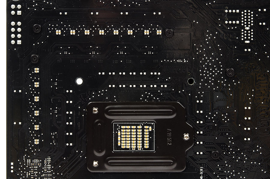 Её встроили в пластиковый навес, расположенный над портами ввода-вывода сзади, второй блок — участок с охладителем чипсета. Там светодиоды распаяны сразу на плате, а затем всё накрыто непрозрачным (!) пластиком. Всего их три штуки, линзы направлены вверх.
