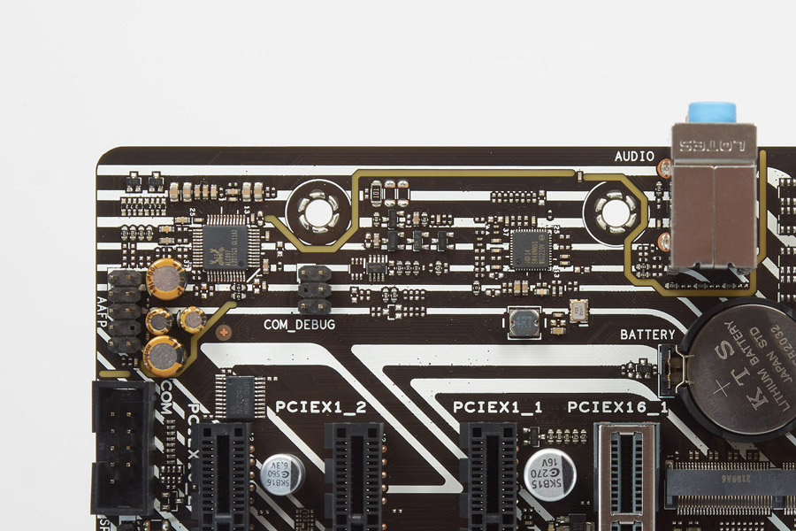 Звуковой кодек обходится без экранирования, расположение у самого угла позволяет надеяться на отсутствие наводок от других узлов. Его сопровождает небольшая группа специальных конденсаторов, за чем-то бо́льшим следует обращаться к более статусным продуктам. Сетевой контроллер от Intel, пусть и не самый скоростной.